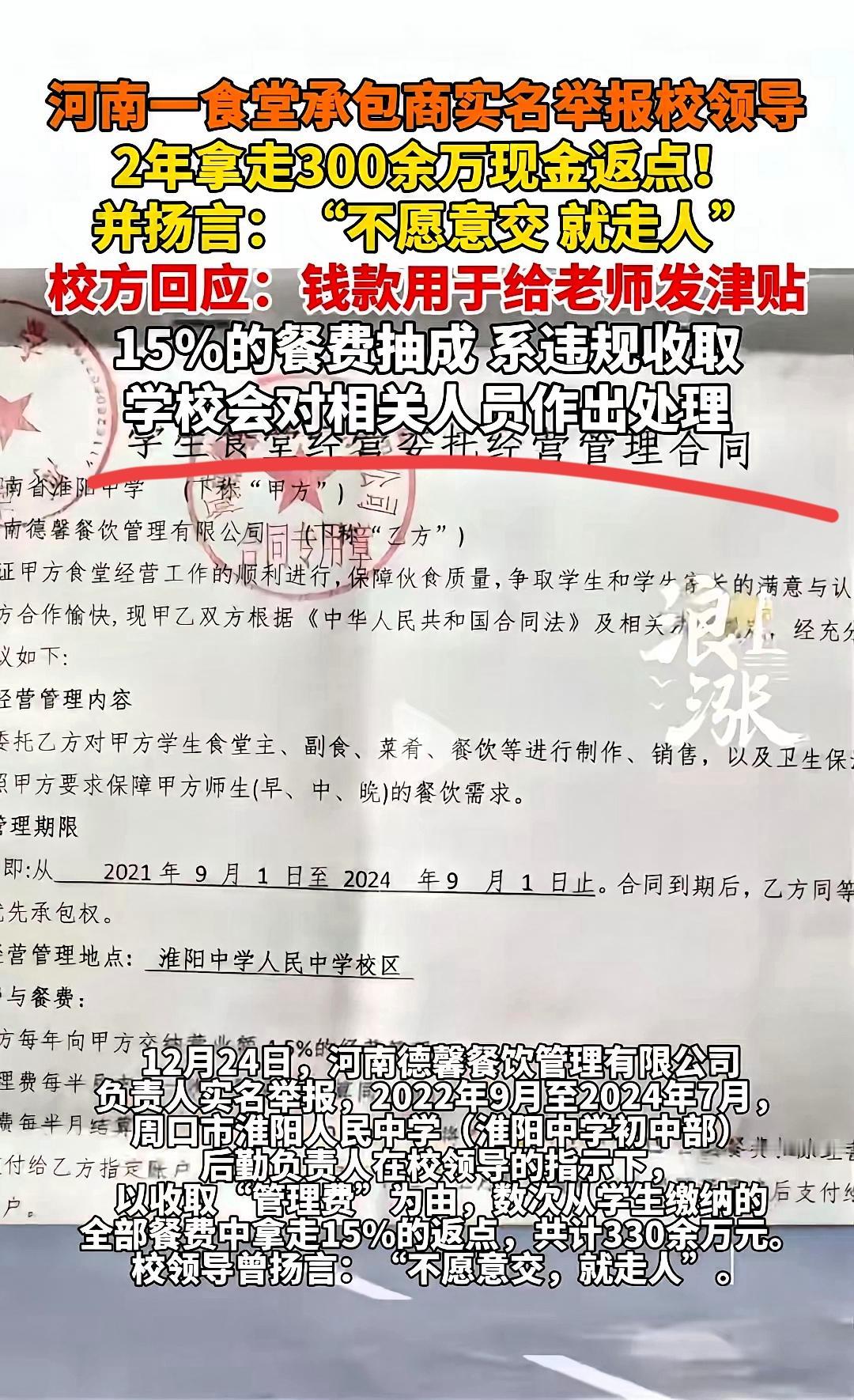 用学生的饭钱发津贴?河南这所学校的操作,真的刷新底线! 3000名学生每天20元餐费,本是保障三餐的活命钱,校方却撕毁合同,把管理费从4.5%硬涨到15%,两年狂收330万现金返点。 一句“不愿意交就走人”,拿捏的是承包商的前期投入,坑的却是孩子的健康。 教育部早明确学校食堂要公益非营利,学生餐费得全用在供餐上。 可某些人却把食堂当摇钱树,用孩子们碗里的肉换自己的津贴,这种“吸血”行为比饭菜差更让人恶心。 所谓教书育人的地方,不该藏着这样的利益算计。 校园净土容不得权力寻租,孩子的餐桌更是碰不得的红线。 你觉得该怎么杜绝这种歪风,守住学生餐的底线?