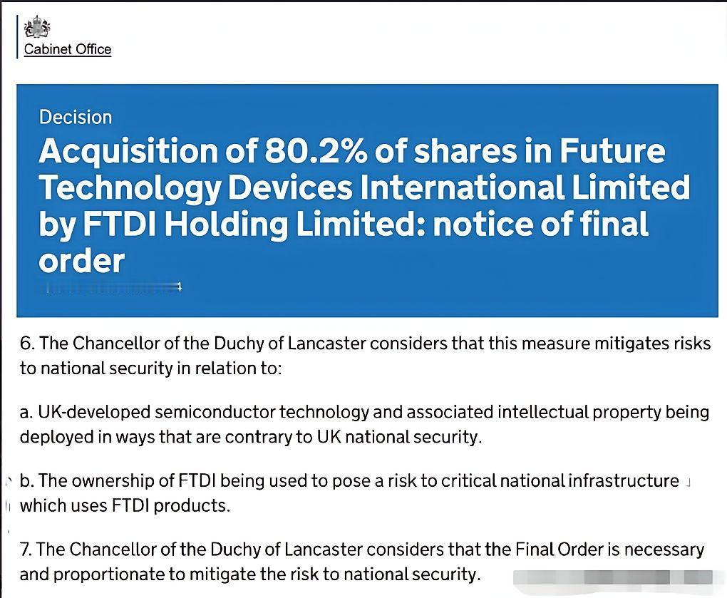 英国又出手了!继荷兰抢夺中资持有的安世半导体之后,伦敦也以“国家安全”为名,逼迫中国建广资产交出其在FTDI公司80.2%的股权。 ​可能有人还不清楚 FTDI 是做什么的,其实这家公司生产的 USB 桥接芯片一点都不神秘,咱们日常用的电脑连接打印机、摄像头,汽车上的电子设备,还有医院里的一些医疗仪器,都离不开这种芯片。 ​FTDI 看着不起眼,却是全球 USB 桥接芯片领域的“隐形冠军”。 全球市场份额常年保持在60%以上,工业自动化设备、物联网终端、航空航天配套产品里,十台有七台用的是它的芯片。更关键的是,这种芯片技术壁垒极高,研发周期要5-8年,短期内很难找到完全替代的产品,堪称“小芯片、大命脉”。 建广资产收购 FTDI 根本不是什么“突然入局”,而是2015年通过正常商业并购完成的交易。 当时建广资产联合其他投资方,以1.5亿美元收购了这家英国老牌科技公司,收购过程完全符合英国法律和国际商业规则,甚至还获得了英国政府的批准。 收购后,建广资产没有干预公司日常运营,反而投入2000万英镑升级研发中心,扩招了120名本地工程师,FTDI 的年营收从收购前的8000万美元涨到2024年的2.3亿美元,员工薪资涨幅比行业平均水平高15%。 在 FTDI 工作了18年的资深工程师马克,至今记得收购后的变化“以前公司研发预算每年都卡得很紧,想推进 USB4.0 桥接芯片项目一直没资金。 中资进来后,不仅批了预算,还帮我们对接了中国的供应链资源,让产品成本降了12%。”马克说,他带领团队研发的医疗设备专用芯片,2023年通过了欧盟 CE 认证,已经进入德国、法国的多家医院。 “现在突然说威胁国家安全,我们员工都觉得荒谬,这几年公司没任何敏感技术外流,所有研发都在英国本土进行。” 英国所谓的“国家安全”,说白了就是借口FTDI 的芯片既不涉及军事用途,也不关联核心基础设施机密,全球有20多个国家的企业都在使用其产品,从未有任何国家提出过安全质疑真正的原因,是这家公司的技术恰好卡在了中国半导体产业链的关键环节——USB 桥接芯片是连接终端设备与数据接口的“桥梁”,而中国作为全球最大的电子。 制造基地,每年要进口近百亿颗这类芯片英国此举,本质上是想切断中国在半导体细分领域的供应链,遏制中国电子产业升级。 这种“明火执仗”的抢夺,已经不是第一次发生2022年,荷兰政府以同样的“国家安全”为由,逼迫中资出售安世半导体股权,而安世半导体是全球功率半导体的龙头企业,产品广泛应用于新能源汽车、5G 设备等领域。 更讽刺的是,这些西方国家一边高喊“自由市场”“公平竞争”,一边动辄动用行政力量干预正常商业交易据统计,2020年至今,欧美国家以“国家安全”为由阻挠中资科技企业收购的案例已达37起,涉及半导体、人工智能、新能源等多个关键领域。 英国的行为正在反噬自身建广资产已经宣布,将暂停未来五年在英国的所有投资计划,原本计划在曼彻斯特建设的芯片测试中心项目也已搁置,这将导致当地失去300多个就业岗位。更严重的是,国际投资者对英国的信任度正在下降——彭博社的数据显示,2025年第三季度,外资对英国科技企业的投资同比下降了28%,不少企业担心自己的资产未来也会被“强制剥离”。 中国企业早已不是任人宰割的对象。建广资产已经启动法律程序,向英国高等法院提起诉讼,质疑这项强制剥离令的合法性。 同时,国内多家芯片企业也加快了 USB 桥接芯片的自主研发进程,上海某科技公司研发的国产 USB 桥接芯片已经通过兼容性测试,性能达到 FTDI 同类产品的95%,预计2026年就能实现量产。 西方用“国家安全”的幌子搞贸易保护,本质上是对自身科技竞争力下滑的焦虑在全球化时代,靠抢夺他人资产、切断供应链来遏制竞争对手,最终只会搬起石头砸自己的脚。中国科技企业在一次次打压中不断成长,自主创新的脚步只会越来越快。 各位读者你们怎么看?欢迎在评论区讨论。