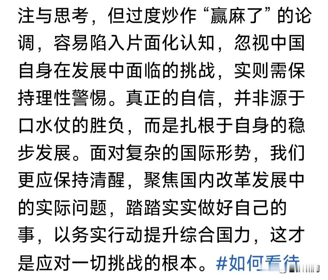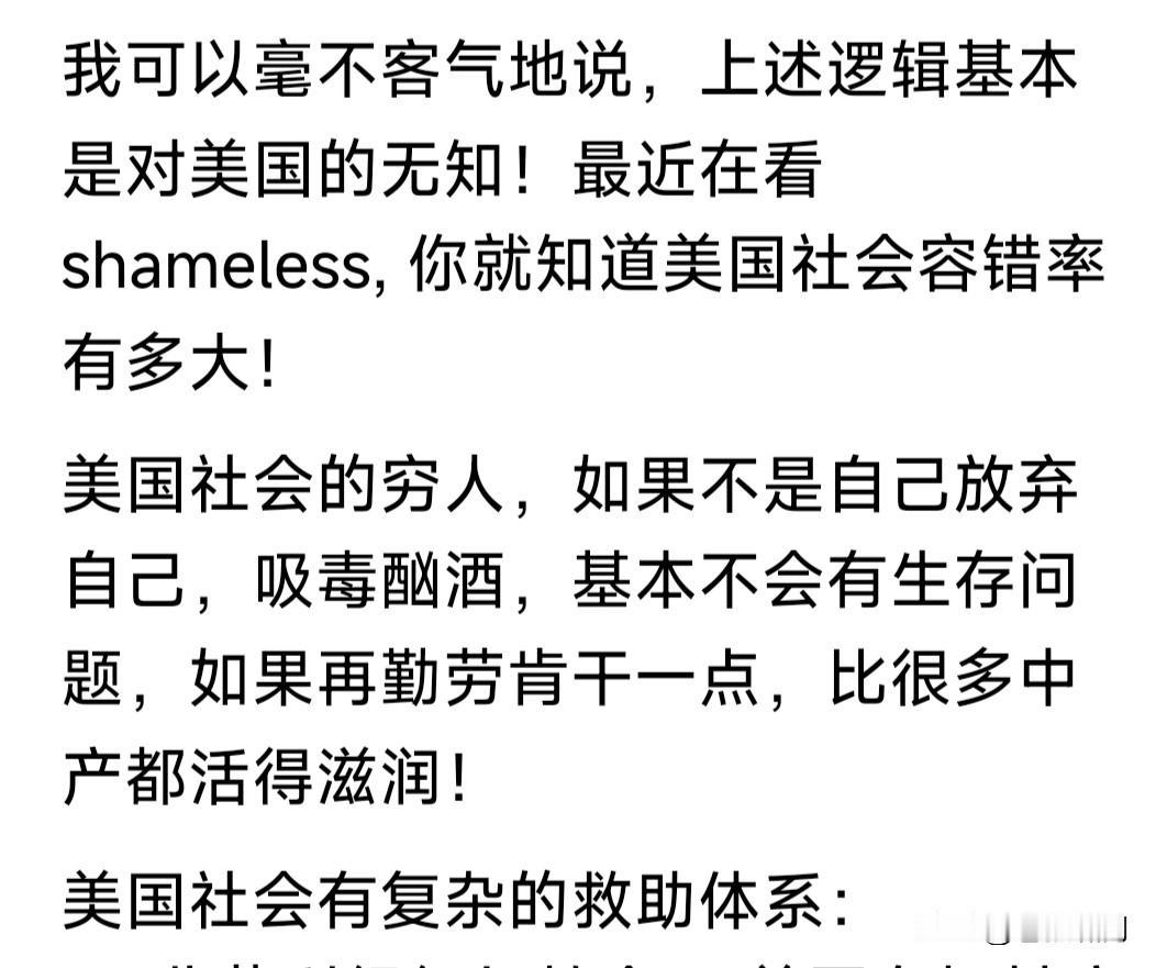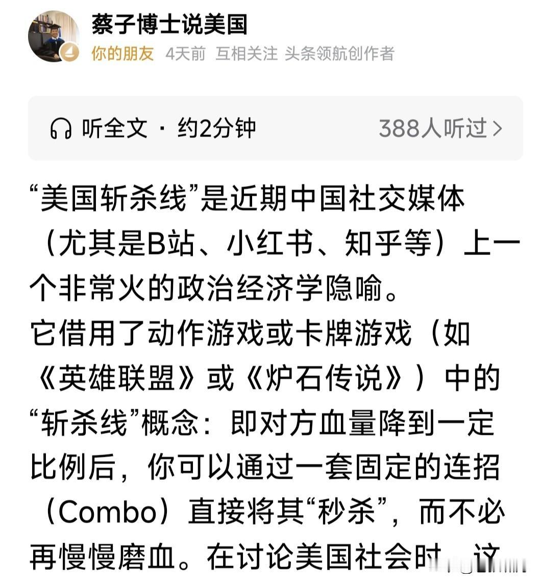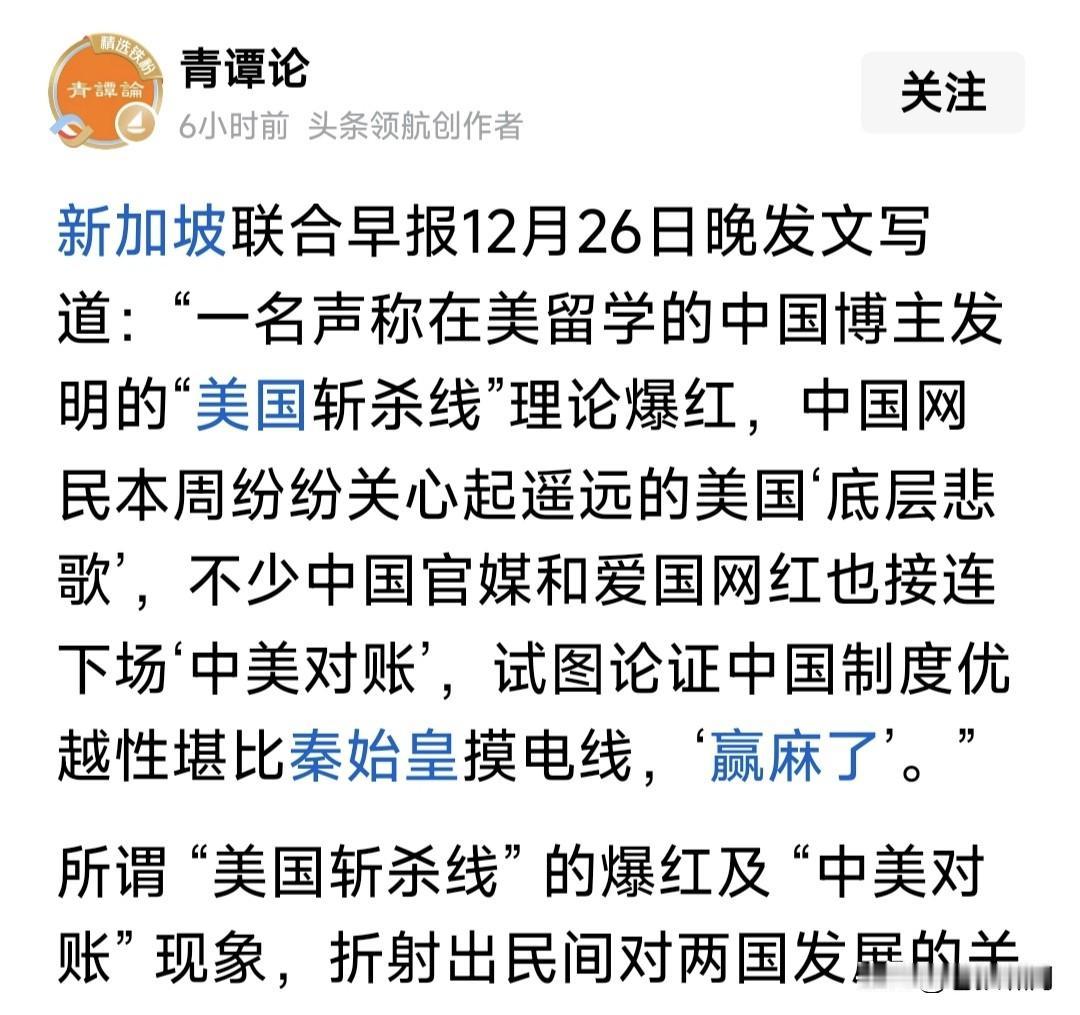 最近“斩杀线”爆火,让人看到美国社会另一面!但这能说明什么问题?媒体过分渲染,网友嘲笑狂欢,令人不解。 前有小红书对账,今有“斩杀线”嘲笑!能说明老美是穷困落后国家吗?只能说明竞争激烈,社会调节存在漏洞吧? 本人赞同“青潭论”观点:过分炒作老美“斩杀线”,会形成片面化认知,造成“美国已衰落”,“我们赢麻了”误解! 苍狼认可“蔡子博士”解惑:美国社会竞争激烈,但能者多得,只要不躺平,不吸毒酗酒,再稍微勤快一点,就能生活得不错,甚至比中产阶层生活还好。 即便遭遇挫折贫困,社会也有保障体系:教会救助,政府兜底,法律保护。美国社会福利虽不如北欧,但也足以让你不挨饿,关键是个人调整摆脱! 本人很佩服“小黄教授”的幽默:万恶的美帝,竟有“斩杀线”?网友你信吗?信者为什么信?不信者为什么不信呢? 苍狼的观点是:不管老美有无“斩杀线”,做好我们自己就好!身在中国,放眼世界,学人之长,强壮自我。完善制度,努力发展,富民强国,振兴中华! …………