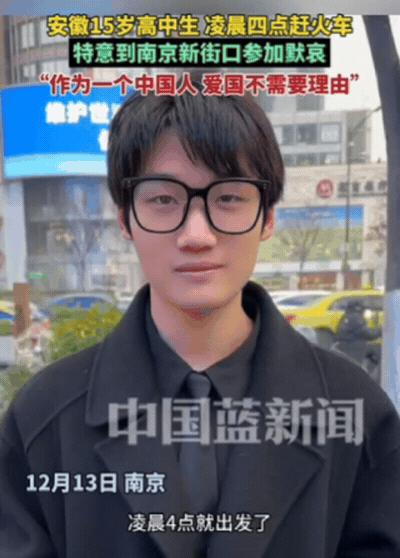 国家公祭日,这高中生火了!安徽一15岁高中生,为了参加南京的默哀活动,凌晨4点赶火车,坐车3个小时,赶到到南京新街口参加默哀。他特意穿了一身黑,黑领带、黑衬衫、黑鞋子。他事后被问为何会专程到南京来?小伙子一句话,让全网破防! 这不是因为别的,而是因为在那身略显稚嫩的骨架上,此时此刻正一丝不苟地裹着一套全黑的行头。黑色的衬衫扣子系到了最顶端,黑色的领带打得严丝合缝,就连脚下的鞋子也是纯黑色的。这不是在模仿成年人的成熟,而是在用最直观的色彩,对自己即将面对的那段历史致以最高规格的敬意。 我们要说的,是那个在国家公祭日那天,瞬间击中无数人泪点的15岁安徽高中生。 关于为什么要在这样一个寒冷的冬日,把自己收拾得如此庄重,去奔赴一场并没有硬性要求的集体默哀,少年的回答简洁得令人心颤。当记者的话筒递到嘴边,询问他不远千里奔波的缘由时,他那双还要面对高考考卷、还带着学生气的眼睛里没有丝毫闪烁,脱口而出:“爱国不需要理由。” 这句话没有任何华丽的修辞,不带一点讨好的做作,就像那天南京上空的防空警报一样,穿透力极强,直抵人心最柔软的地方。 把时间的指针稍微回拨一点。在绝大多数同龄人还蜷缩在温暖被窝里贪恋梦乡的时候,这名少年已经在凌晨4点的蚌埠醒来了。那是黎明前最深的黑暗,天寒地冻。他独自一人赶往火车站,甚至连这一路上的孤单都算不上什么阻碍。三个小时的火车车程,这是一场只属于他一个人的“长征”。他或许在晃动的车厢里也没敢合眼,脑海里翻涌的可能不仅仅是教科书上那些冰冷的年月日,而是那种早已融入骨血的民族痛感。 这种“刻意”,实在太动人了。很多人习惯了那种形式主义的打卡,但你很难相信一个未成年的孩子,会在没人监督的情况下,把一场个人的悼念哪怕是细微到领带的颜色、出门的时间都安排得如此充满仪式感。他找了一个靠前的位置站定,当上午10点01分的警报声划破长空,整个城市按下暂停键,所有的车辆停驶鸣笛,他挺得笔直的腰板和那双手自然下垂的姿态,就像是一座微型的丰碑,哪怕低着头,那份精气神也是昂扬的。 现在网络上总有一种论调,觉得年轻一代是在蜜罐里泡大的,离苦难太远,离手机太近,好像对那种厚重的家国情怀已经变得钝感。但这位从安徽一路奔袭而来的少年,用那一身漆黑的肃穆,给了这种偏见最有力的一记反击。他没有被父母耳提面命,没有学校的任务清单,完全是内心的驱动力让他走到了这里。 从1937年那个血色的凛冬到今天,八十多年的光阴足以让很多人和事变得模糊。幸存者正在老去,证言正在变成黑白的档案,但记忆的传递并不全是依靠书本和博物馆,它更依靠像这样鲜活的个体。三十万遇难同胞的数字从来不是枯燥的统计学,它压在每一个中国人的心头。这个15岁的孩子懂这个分量,他脚上那双黑鞋子踏上的,是先辈们曾用血泪浸泡过的土地。 看着他在人群中那样笃定地站着,让人不禁想起梁启超先生那句振聋发聩的“少年强则国强”。所谓的“强”,不仅仅是体魄的健硕或是成绩的优异,更是指这种精神内核的硬度。他在践行爱国这个宏大命题时,找到了一种最朴素也最有力的方式:在特殊的日子,到特殊的地点,低下头颅,却挺起了脊梁。 这不需要多么深奥的理论来解释,就像他自己说的,真的不需要理由。这种情感,就像呼吸一样自然,像血液一样滚烫。那一身黑衣,不仅是哀悼的礼服,更像是一种无声的誓言——那些屈辱与抗争的历史,这一代人没有忘,下一代人更不会忘。 少年眼里的坚定,比任何教科书式的宣教都有说服力。他那一丝不苟的着装和凌晨赶路的疲惫,被这一句话赋予了灵魂。他让我们确信,只要还有这样的少年在,历史的记忆就不会断层,民族的精神就能如薪火般代代相传,永不熄灭。