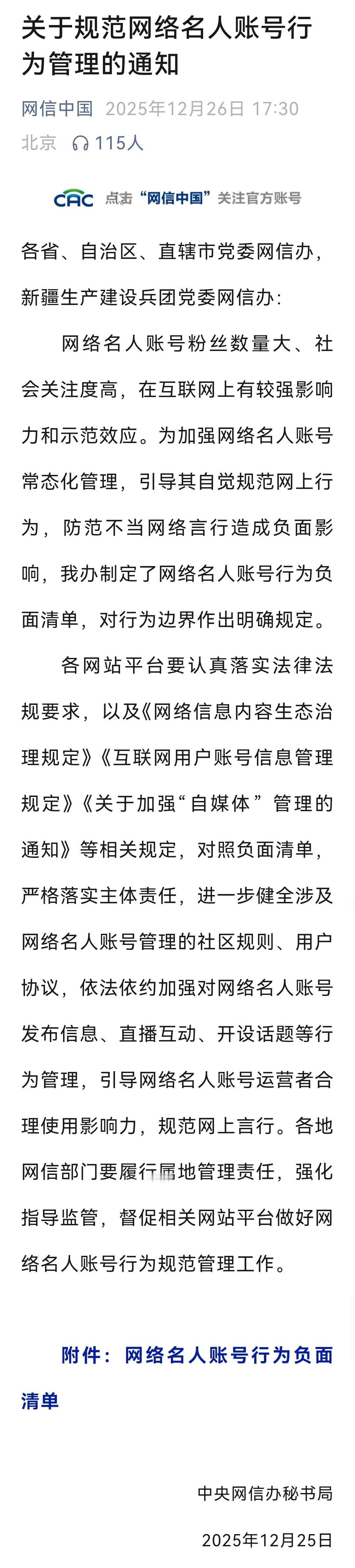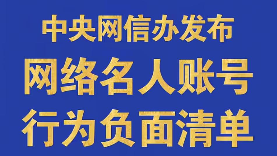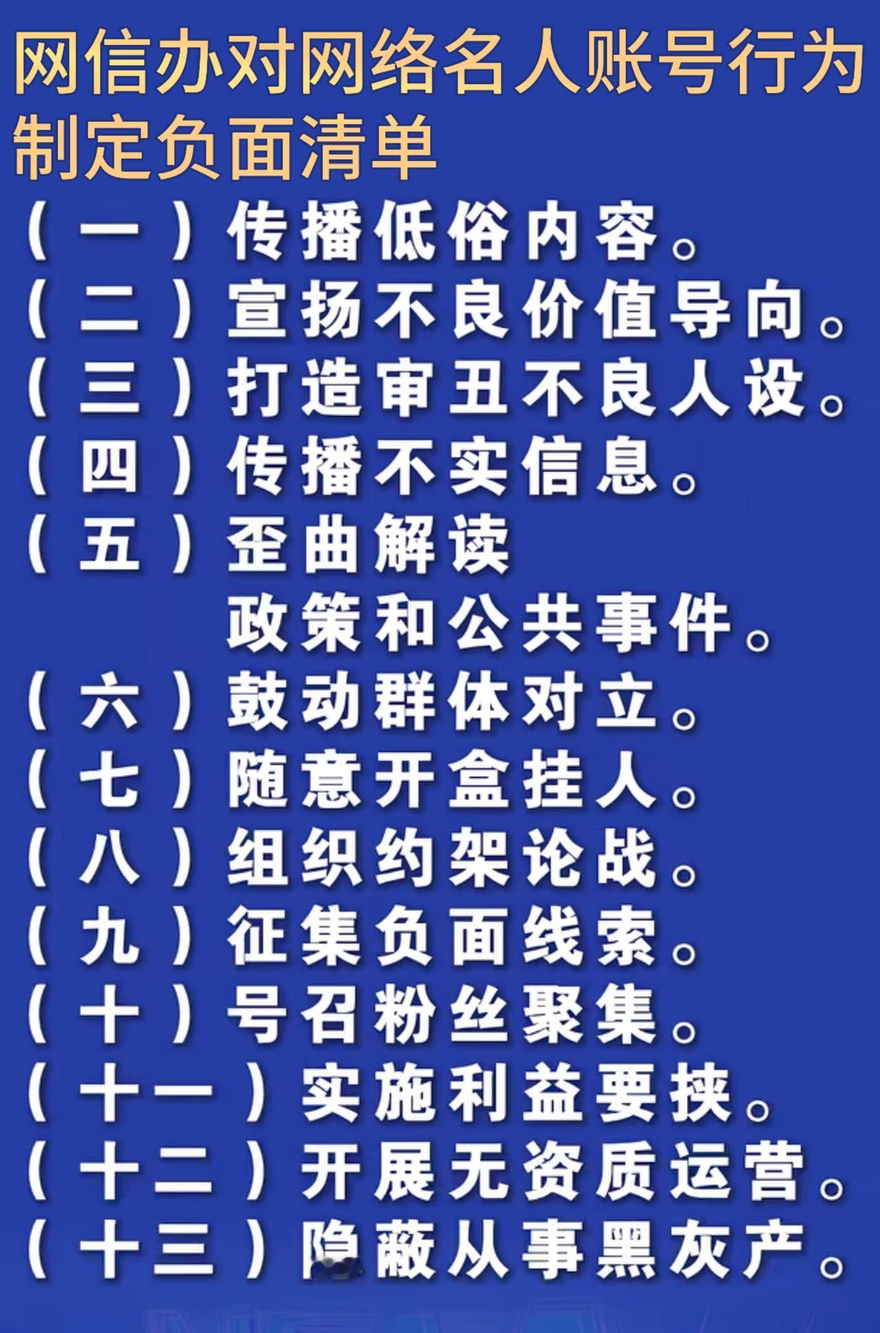 网信办制定负面清单,规范网络名人账号行为。 近日,网信办发通知,根据网络名人账号粉丝数量大、社会关注度高、互联网上影响力和示范效应较强等特点,为加强对其常态化管理,引导其自觉规范网上行为,防范不当网络言行造成负面影响,制定了网络名人账号行为负面清单,对行为边界作出明确规定。 网络名人账号行为负面清单共十三项: 1、传播低俗内容。 2、宣扬不良价值导向。 3、打造审丑不良人设。 4、传播不实信息。 5、歪曲解读政策和公共事件。 6、鼓动群体对立。 7、随意开盒挂人。 8、组织约架论战。 9、征集负面线索。 10、号召粉丝聚集。 11、实施利益要挟。 12、开展无资质运营。 13、隐蔽从事黑灰产。 通知要求,各平台网站要根据相关规定,严格落实主体责任,依法依约加强网络名人账号行为管理,引导和规范网络名人账号规范网上言行。各地网信部门要履行属地管理责任,强化指导监管,督促相关网站平台做好网络名人账号行为管理工作。