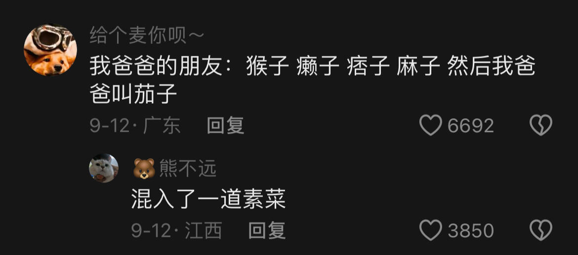 我爸爸的朋友:猴子癞子痞子麻子然后我爸爸叫茄子