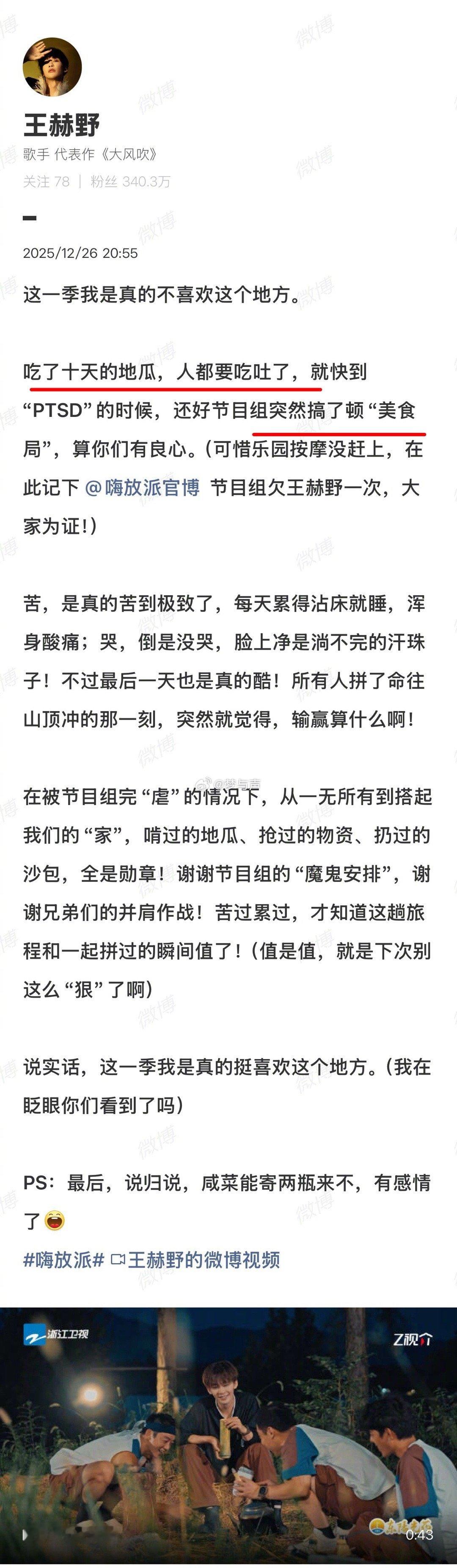 王赫野吃了十天地瓜吃吐了 恭喜王赫野成功解锁“地瓜ptsd”成就!十天野外生活,地瓜吃到吐,还得苦中作乐发明新吃法。现在节目收官,终于可以大声说:地瓜,我们暂时不要再见面了!