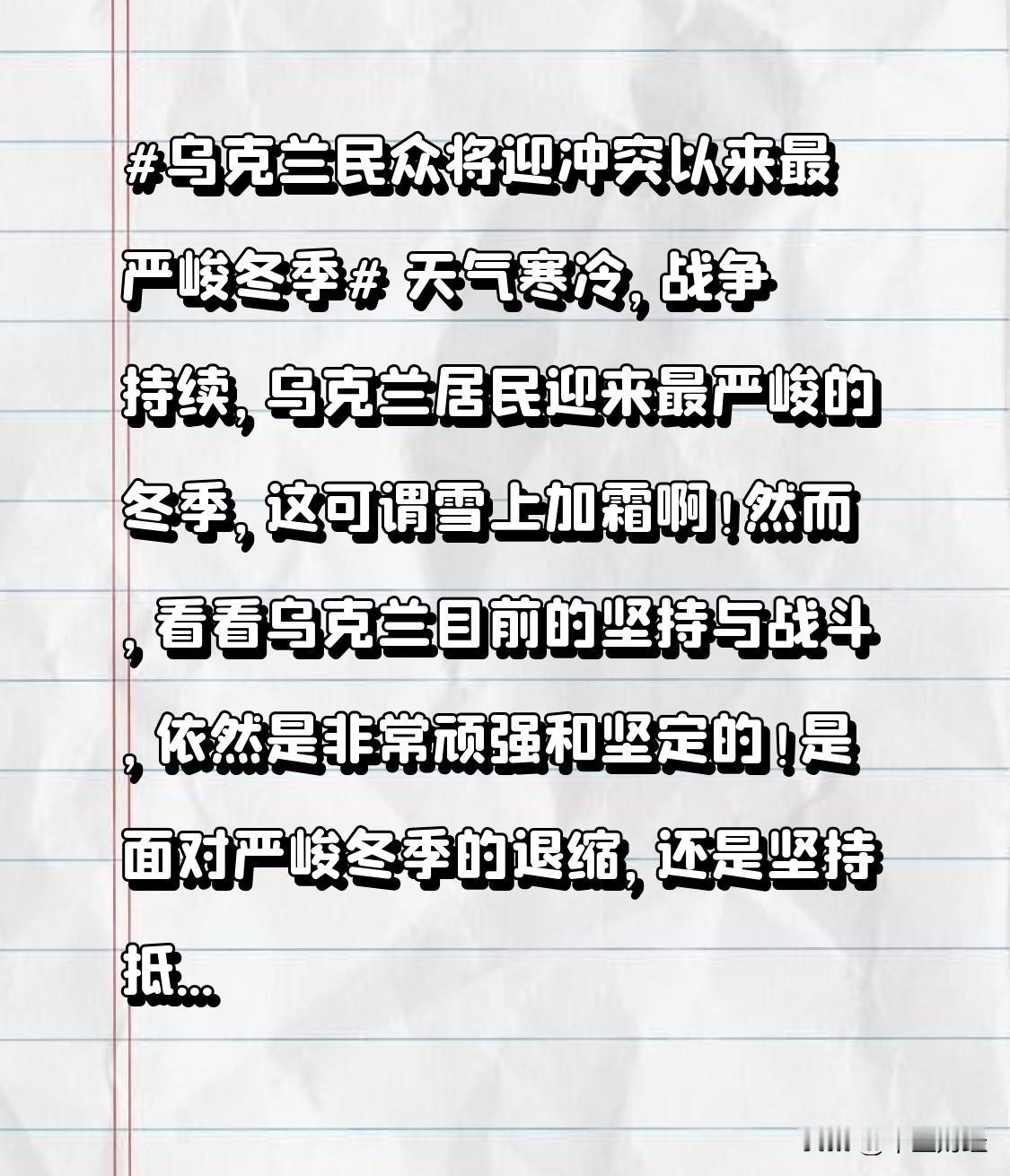 天气寒冷,战争持续,乌克兰居民迎来最严峻的冬季,这可谓雪上加霜啊! 然而,看看乌克兰目前的坚持与战斗,依然是非常顽强和坚定的!是面对严峻冬季的退缩,还是坚持抵抗严冬的信心持续,这都不是一个轻松的话题!