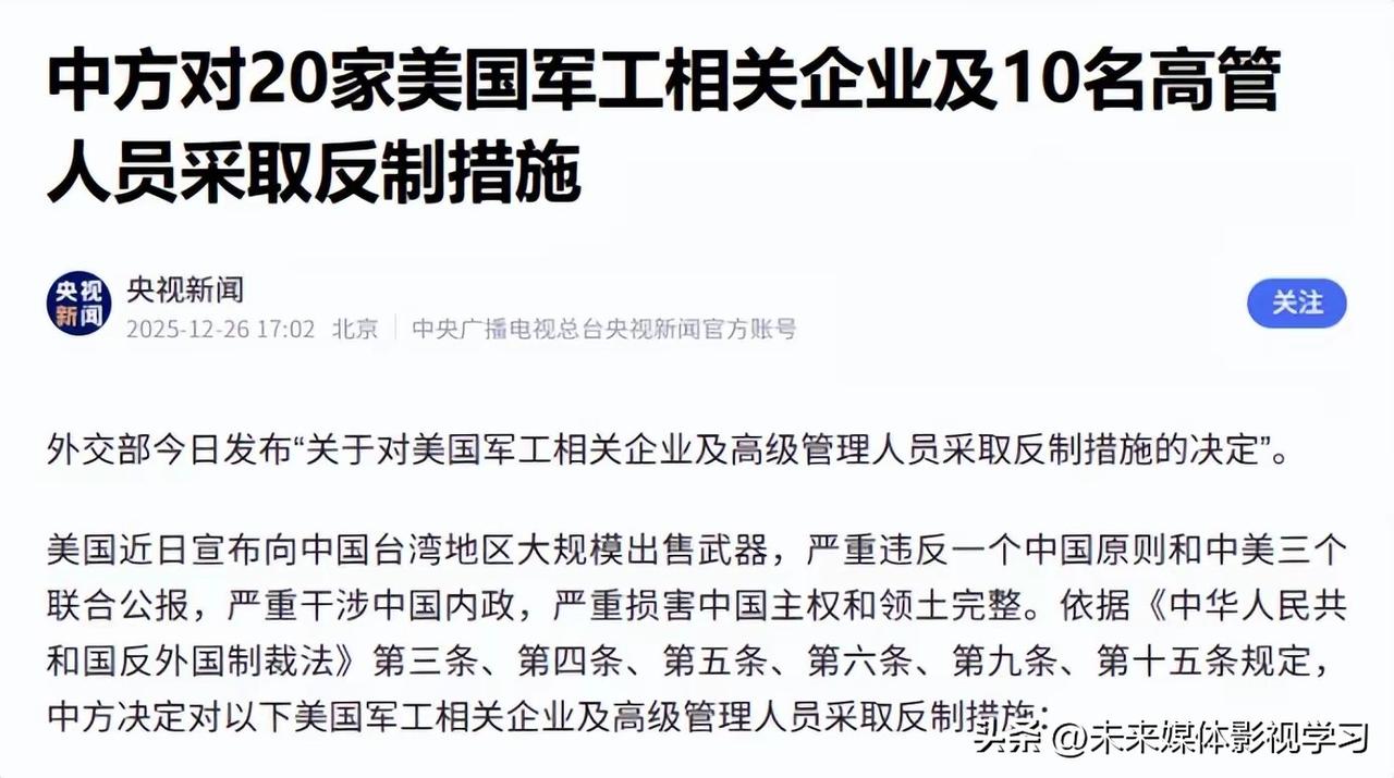 美国刚宣布对台军售,咱们没马上吵吵,沉默了整整十天。结果反制清单直接甩出来——20家美军工企业+10名高管,全是核心玩家。这哪是抗议?分明是算总账! 仔细看名单就懂了:诺斯罗普·格鲁曼(造核威慑系统的)、波音军工厂、还有一堆搞无人机和人工智能的尖端公司…专挑命门打。不光禁止交易,还冻结他们在华资产,高管来华签证也停了。这招狠在哪?——让卖武器的人明白,生意不是白做的,选了政治投机,就得付出真金白银的代价。 很多人说“制裁有用吗”?我觉得这次不一样。中国既是市场,又是稀土等关键材料的供应方。断的不是一笔订单,是整个产业链的合作可能性。更关键的是,把个人和企业绑在一起制裁,意味着高管以后去哪投资、哪开会都可能受限。这压力是直达决策层的。 美国估计也懵了:原来安静那十天,不是在犹豫,是在织网。现在网收了,才发现每个绳结都拴在要害上。 其实信号一直很直白:台湾问题,你别碰,碰了就疼。只是以前可能觉得能侥幸,现在清单拍桌上,下次再伸手可得掂量了。 说到底,大国博弈,不是比谁嗓门大,而是比谁让对手痛得更实在。这份清单,就是个疼痛说明书。 你觉得这种“精准打击”反制,效果会如何?