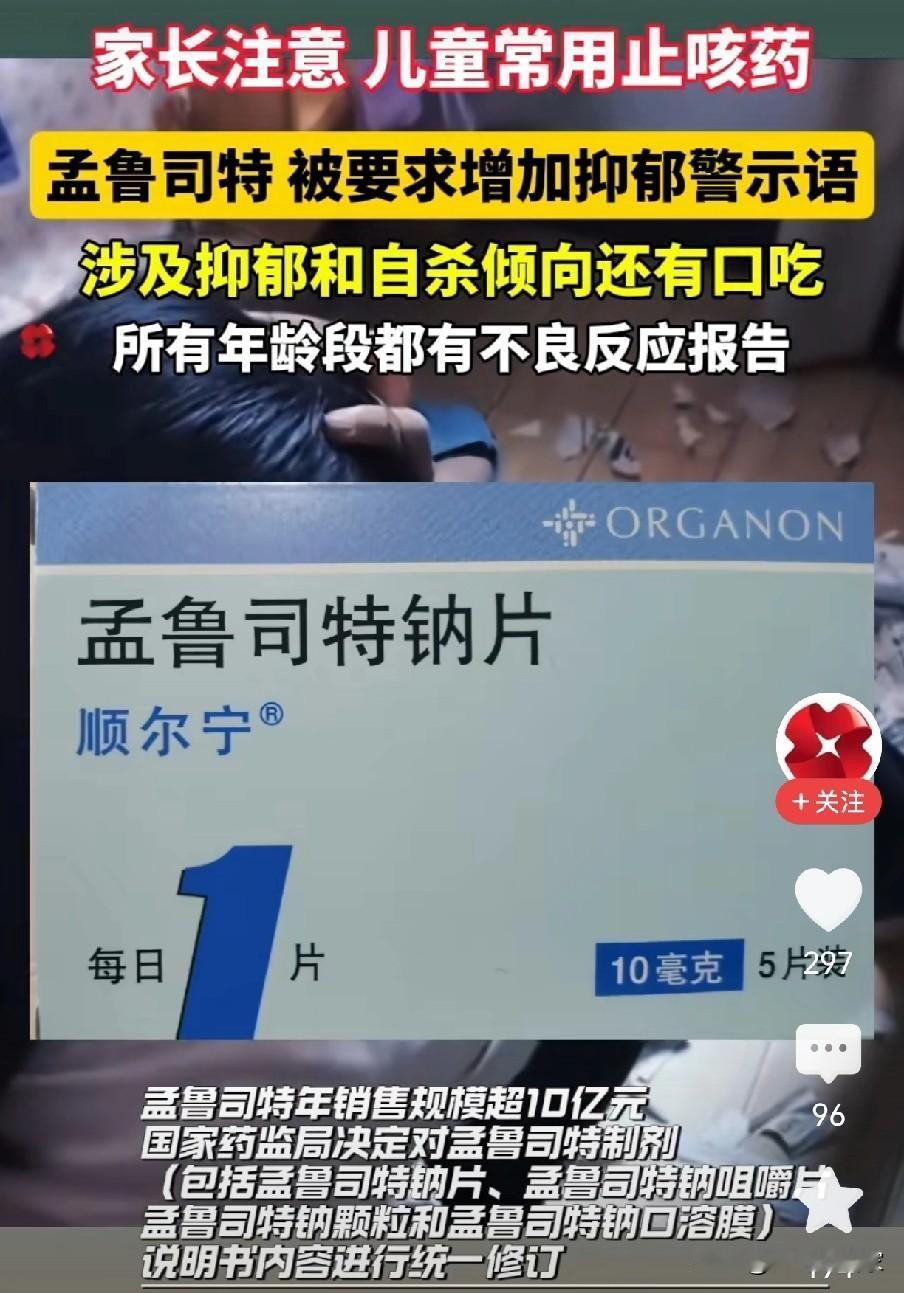 所有人都要警惕,“孟鲁司特”的说明书要修改了。这个药都被正式提示可能存在“精神相关不良反应”。简单说,就是它可能会影响情绪、睡眠、甚至出现一些让人不安的精神症状。 因为服用方便,每天一次,很多家庭把它当成“常备药”,虽然它对某些过敏性疾病确实有一定效果。尤其是孩子有鼻炎、咳嗽、喘息时,医生常开,家长也习惯性给孩子吃。但现在,情况不一样了。 无论是成年人还是儿童,都被明确列入警示范围。这一点非常关键。它不再是“极少数个案”。不少专家的建议是,如果能通过其他方式控制症状,或者有替代药物可选,那就尽量避免使用孟鲁司特,特别是儿童。 只能说,药物是把双刃剑,能治病,也可能带来伤害。用药最好先问医,其实最好的方式是告知有副作用的药,应该再推荐一个平替的药,这样老百姓心里都没底。