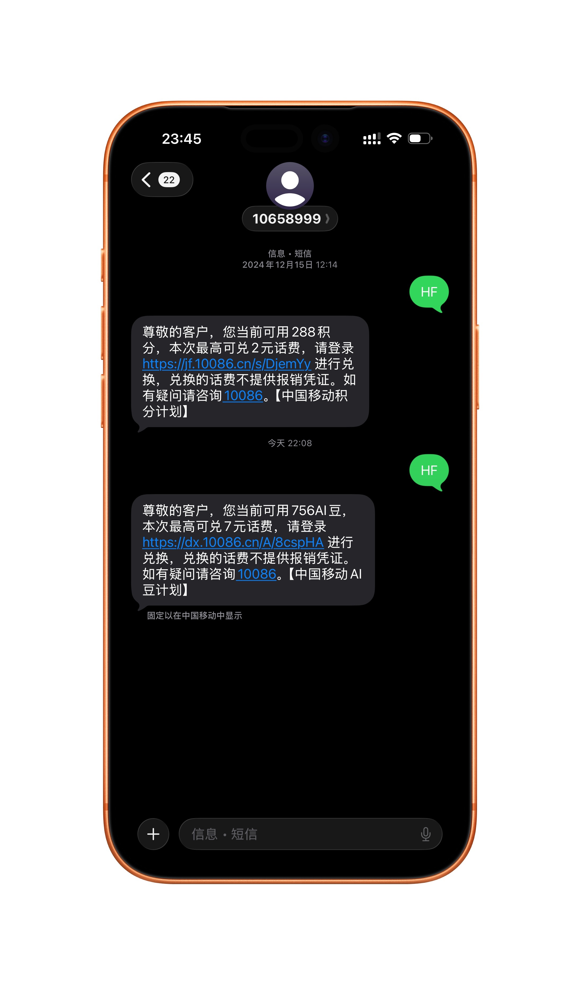 年底了,大家记得清空一下自己的运营商积分。发短信兑换中国移动:发送 HF 到 10658999中国联通:发送 JFJFQ 到 10010中国电信:发送 105 到 10001我的主卡联通,兑换了 12 块钱话费