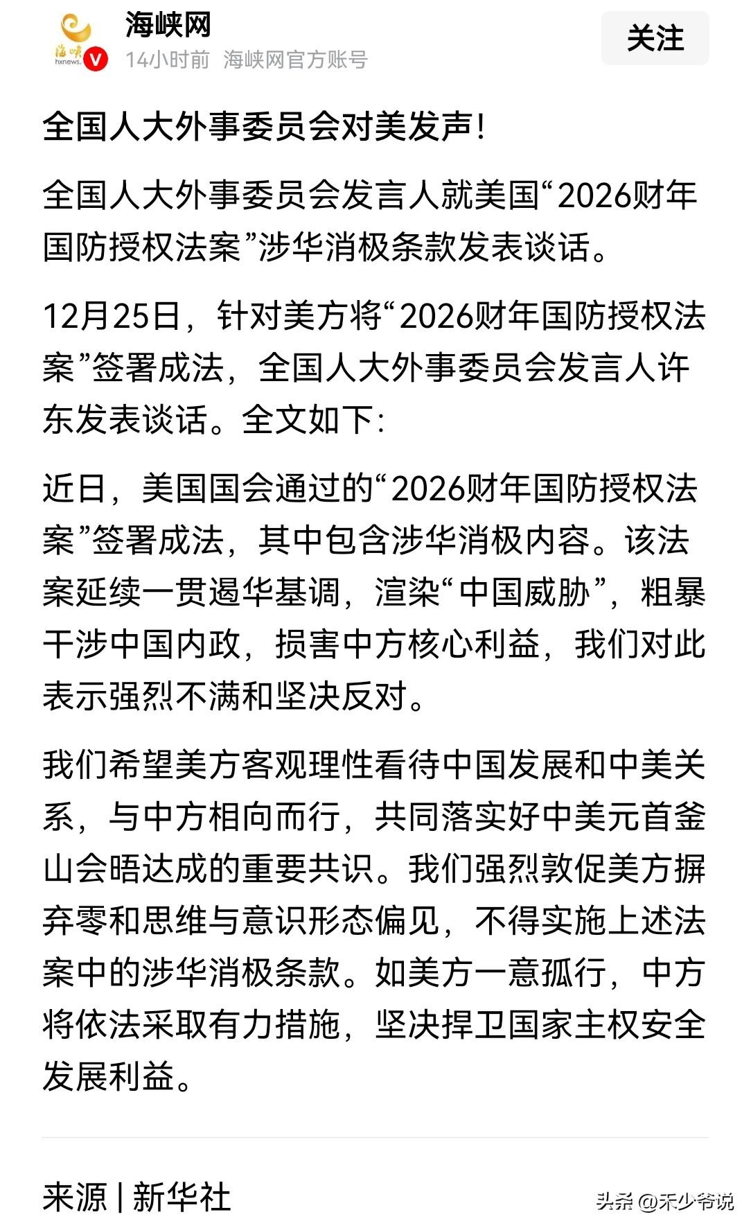 最强反击要来了,中国最高权力机关对美国发声,要知道这可是中国最高权力机关 今天全国人大外事委员会就美国“2026年国防授权法案”涉华消极条款发表谈话。 看似平常的开端,实则蕴含着不为人轻易察觉的微妙玄机与深刻内涵。 咱们国家最高的立法机关——全国人民代表大会的外事委员会,发表了关于美国“2026年国防授权法案”中一些涉华条款的不满声明。 虽然这个声明看起来普通,但其实代表着我国对美国一些“限制中国”的措施表达了明确的反对态度。 须知,全国人民代表大会乃我国最高立法机关,其权能至重。 我国的根本大法——宪法,便是由它制定,彰显着无上的权威与重要地位。 它的每一句话,基本上都代表着国家的立场。 此次全国人大外事委员会谈话绝非泛泛而谈,而是针对美国出台的一些限制中国发展的法案,发出了掷地有声的“警告”,彰显坚定立场,警示美方勿肆意妄为。 这意味着,我国对于美国试图限制中国,甚至干涉中国内政的行为,已经做好了反击的准备。 其实,这次发声的背景很复杂。 美国每年都会推出一份名叫“国防授权法案”的法律,里面包含了很多军事和安全方面的内容。 美国的这份法案中,加入了不少针对中国的限制,比如限制中国在某些地区的军事发展,限制技术交流,甚至试图在某些国际事务中遏制中国的崛起。 对于这些限制,我国早就表达过不满,认为这些都是干涉我国内政、阻碍我们发展的大事。 美国一直想通过各种手段遏制中国,特别是在技术、军事、外交方面。 去年以来,美国不断对我国产业链进行打压,试图封锁我们的关键技术,限制我们的发展空间。 面对这样的压力,我国一方面在坚持自主创新,另一方面也在加快自身的步伐,提升国家的安全和实力。 此次全国人大外事委员会的表态,不啻为对美国“霸凌”行径的有力回击。 彰显了维护国家权益的坚定决心,以明确态度宣告不容他国肆意妄为。 你可能会想,这到底意味着什么?其实,这就像咱们平时打架时,遇到对方出手不讲理,咱们就会站出来说“不行”。 不管是打架还是国际关系,谁都不能随便侵犯我们的底线。 国家法律也明确规定,任何重大的对外行动,都必须经过最高立法机关的批准。 此非仅为一项制度安排,更是国家捍卫主权之底线。 它承载着国家的核心利益与尊严,不容任何侵犯与逾越,是国家长治久安的坚实保障。 现在,国家用这样的方式,告诉全世界,我们对于那些试图限制中国发展的行为,是绝对不会坐视不理的。 为什么会这样?其实,原因很简单。 过去几年,咱们国家的经济、科技、军事实力都在快速增长。 我们逐渐走出了“跟随”的状态,变得越来越有底气。 有人说,现在的中国已经不再是过去那个被动挨打的国家了,而是开始主动掌握自己的命运。 无论是科技创新领域,还是国际事务舞台,我们皆彰显出非凡实力。 以卓越之姿应对挑战,于不同维度绽放光彩,尽显强大竞争力与影响力。 你可以看到,国内很多科技企业崭露头角,科技水平不断提升,军事现代化也在稳步推进。 这次全国人大表态,其实也是在告诉国际社会:我们有底线,有原则。 任何想干涉中国内政,限制中国发展的国家,都要付出代价。 过去一些国家试图用贸易制裁、技术封锁、甚至军事威胁来压制中国,但都没有得逞。 我们在坚持中不断壮大,逐渐走出了“被压制”的阴影,变得更加强大和自信。 你可能会觉得,这样的反应会不会引起冲突?其实不一定。 中国的反制措施,更多是法律和制度上的。我们有明确的法律依据,任何行动都要经过国家最高立法机关授权。 这种方式,不是盲目的冲动,而是经过深思熟虑的。 我们既要维护国家的安全,也要在国际上显示我们的责任感。 我们希望用实际行动,告诉世界:我国家无意与任何国家发生冲突,但也绝不会让任何人侵犯我们的核心利益。 说到底,这次发声是中国逐步增强话语权的表现。 我们在国际事务中,越来越有底气去表达自己的立场。 过去一些国家总是试图用各种手段压制我们,但难以得逞。 中国的崛起,让国际社会看到了一个不一样的中国。 我们不再是那个任人宰割的国家,而是拥有自主决策权的强大国家。 未来,咱们会继续坚持自己的发展道路。 虽然目前还没有公布具体的反制措施,但可以肯定的是,我们已经做好了各种准备。 我们会用法律、制度,甚至是外交手段,来保护自己。 国家的实力不断增强,反击的底气也在不断积蓄。 我们相信,随着时间推移,中国会在国际舞台上扮演越来越重要的角色。 参考:东南网...会发言人就美国“2026财年国防授权法案”涉华消极条款发表谈话