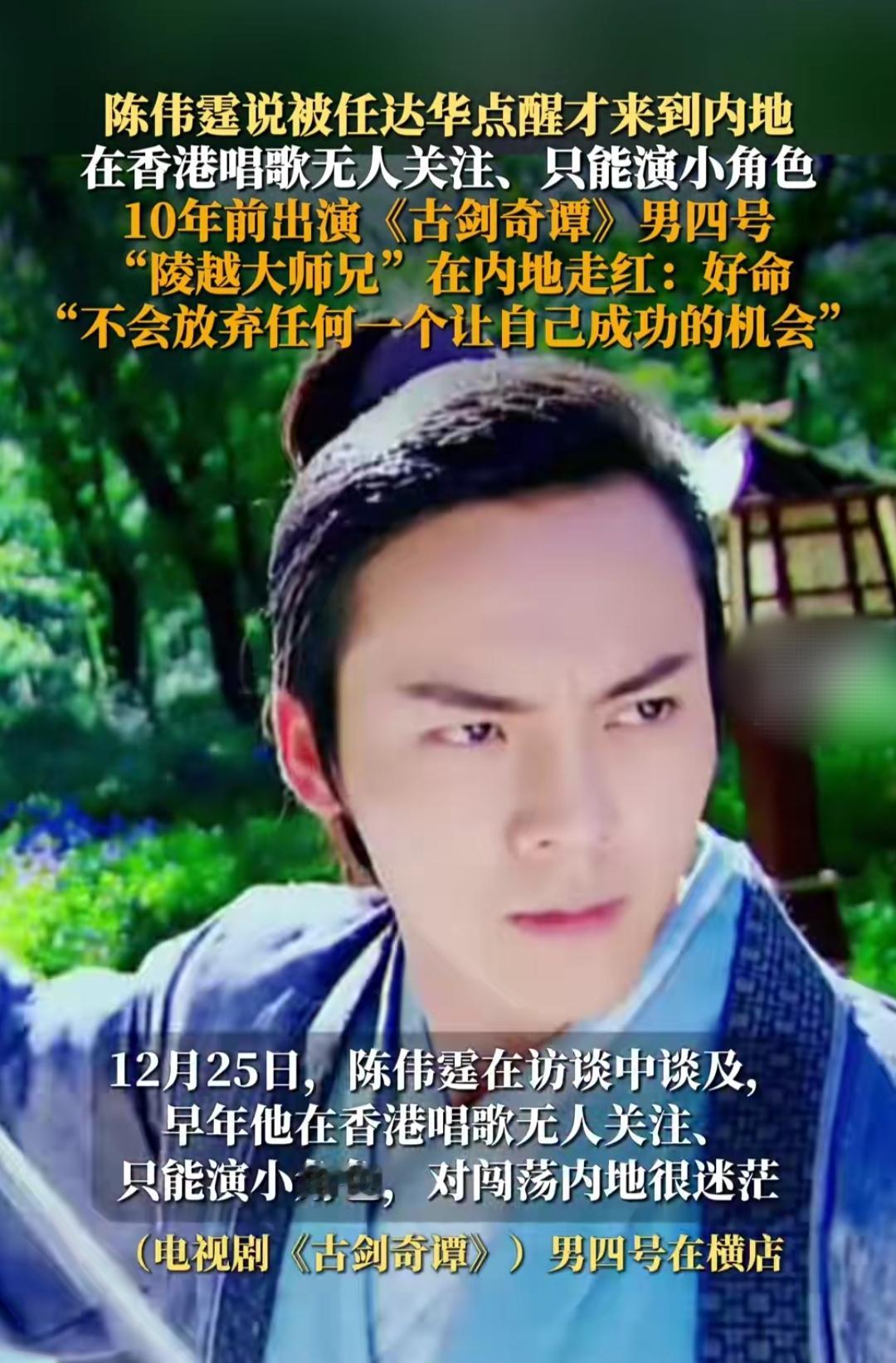 谁能想到内娱顶流陈伟霆,也曾在港圈低谷自嘲是“中学毕业的废物”?在香港摸爬滚打十年,唱歌歌红人不红,开演唱会台下冷冷清清,演戏只能跑龙套,最多只有三句台词,妥妥的“万年新人王”,连赴内地发展都怕得犹豫。 幸好他在拍摄《救火英雄》时遇到了任达华,迷茫时忍不住倾诉困境,前辈一句话点醒梦中人:“内地市场大,你的形象和实力会有机会”。就这一句点拨,让他放下顾虑奔赴横店,接下了《古剑奇谭》里的男四号陵越大师兄。 谁承想这个配角直接让他爆红,后续《老九门》等作品更是站稳脚跟,从港圈边缘人逆袭成影视综三栖顶流。其实人生哪有那么多一蹴而就,大多是迷茫时有人指路,困境中不肯放弃。陈伟霆的逆袭告诉我们,机遇很重要,但敢于抓住机遇、坚持到底的勇气,才是破局的关键。