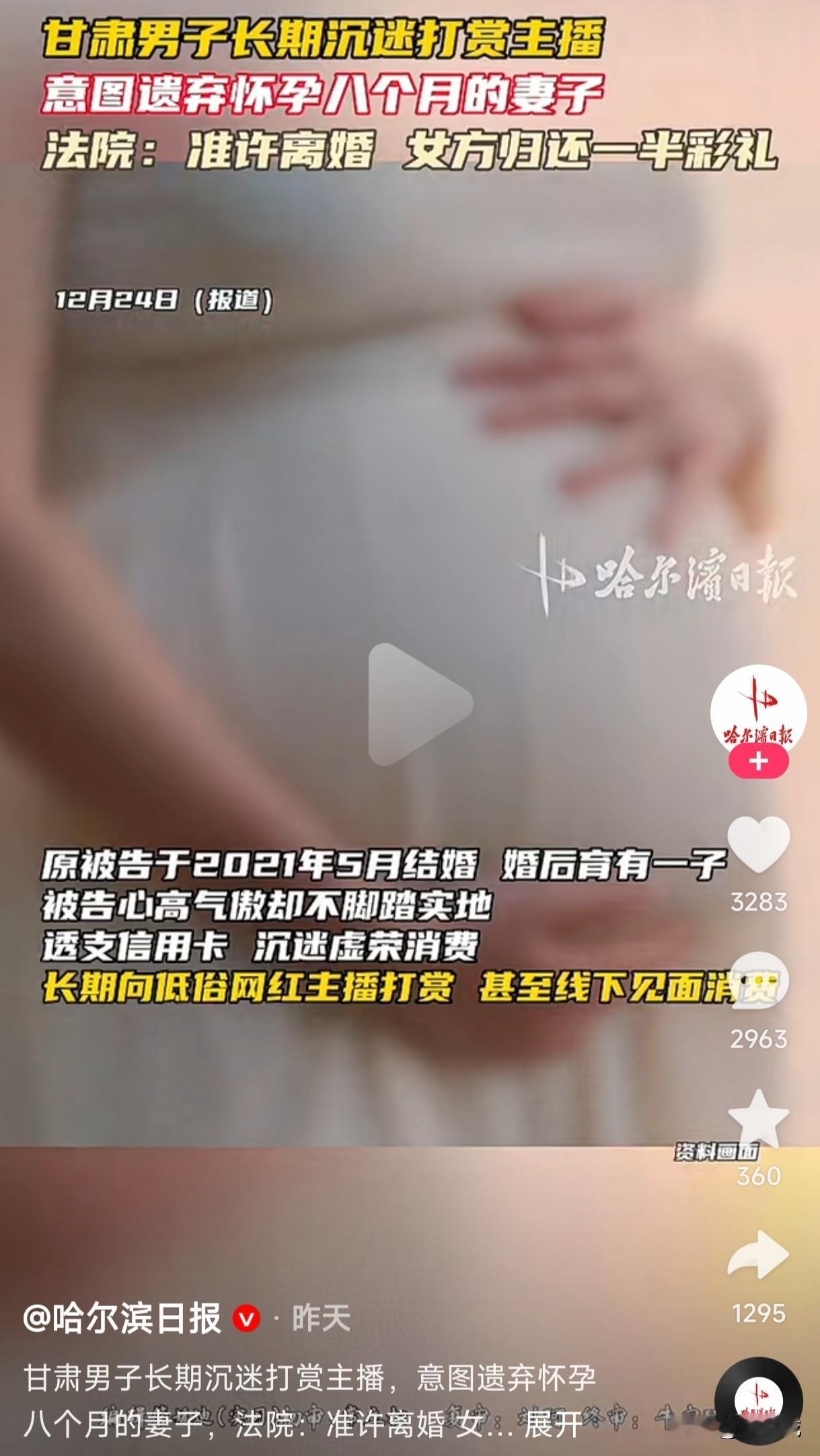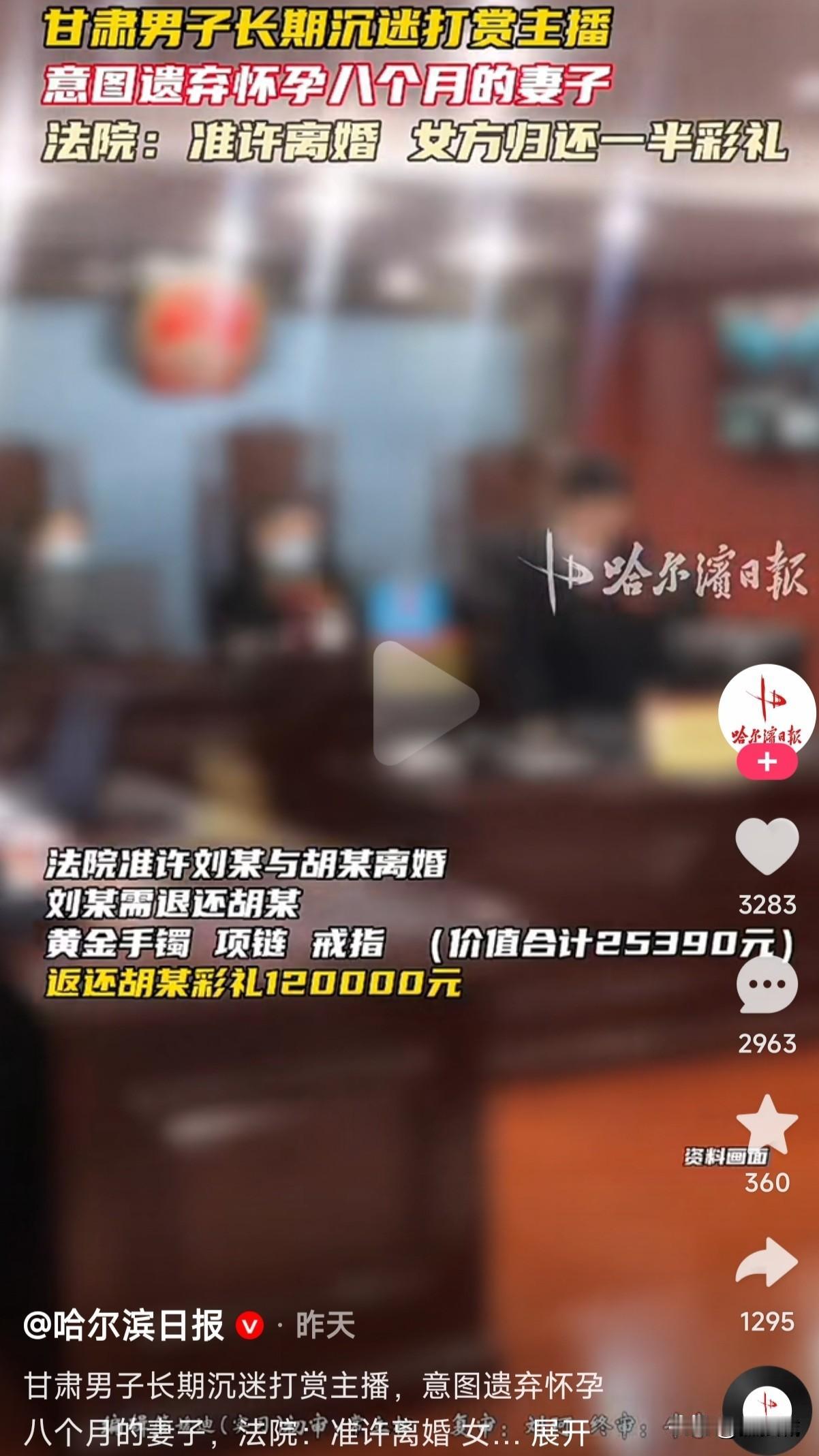 甘肃女子结婚4年育有一子,如今有身孕8个月,丈夫长期沉迷于打赏女主播不务正业,女子起诉离婚,法院准许离婚,女子退还12万彩礼和三金。 第一次见到结婚几年后孩子都有了,居然判决还让女方退彩礼的,这到底是什么逻辑,我只见过结婚时间不长离婚退彩礼的人不计其数,但这种还真是没有见过,男方婚后不务正业沉迷于网络主播,甚至刷信用卡给主播刷礼物,私底下还约会见面消费,女方提出离婚这也很正常,但这让女方返还三金退12万彩礼是什么意思,实在是搞不懂这样的操作。 并且女方已经怀孕 8个月,这孩子生下来男方难道不给抚养费吗?或者是只要女方生下来就和男方没有任何关系了,结婚四年了判决离婚,居然让退彩礼,真是颠覆了我的三观,第一次见到这种操作,真是让人无法理解!