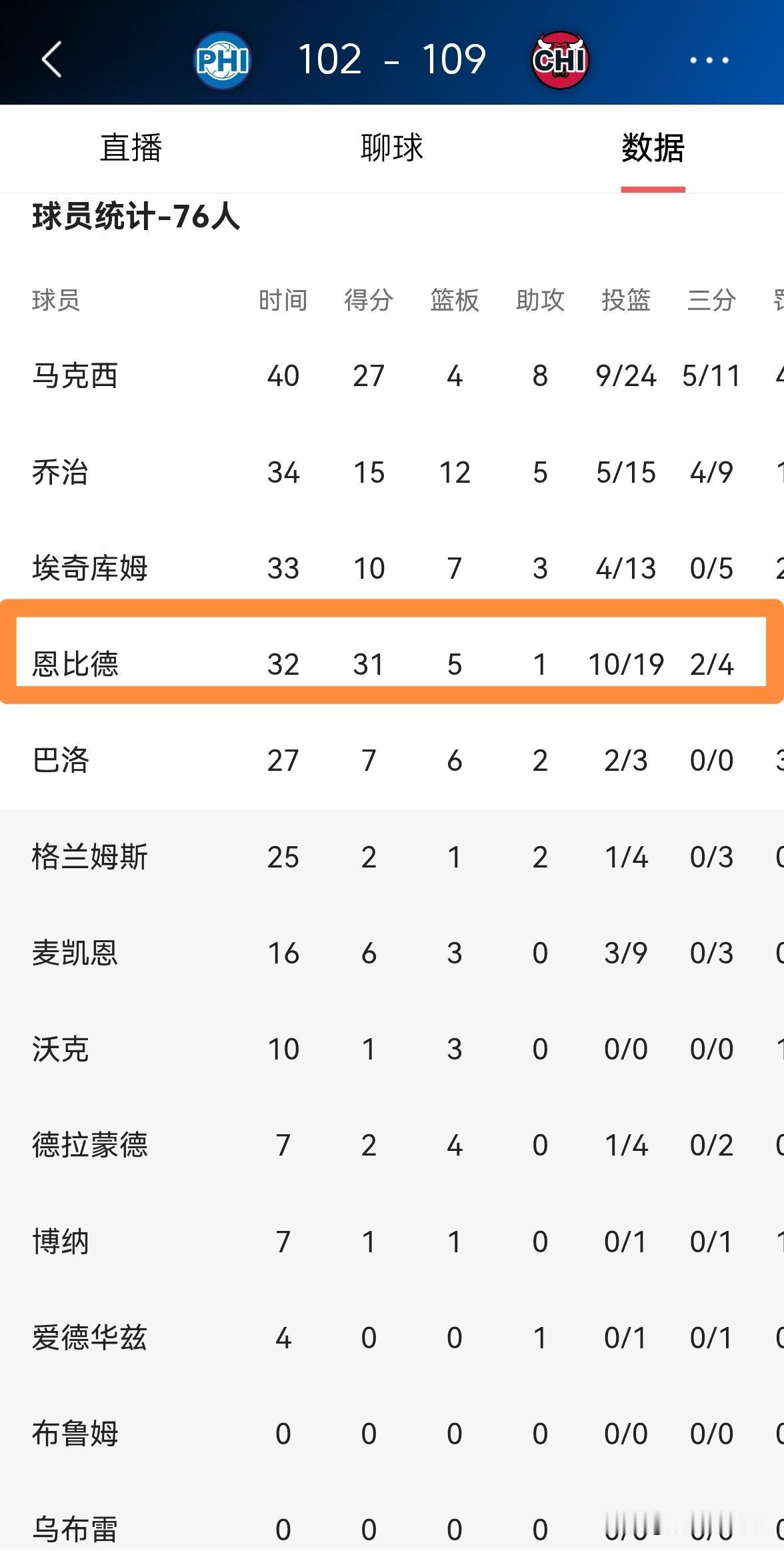 76人超级巨星恩比德真是太心累了!今天76人在客场以102:109不敌公牛,此役恩比德在攻防两端都拼尽全力,可惜的是他身边的队友都太不给力了,因此他也回天无力。 全场比赛下来,恩比德首发出战32分钟,投篮19中10,其中三分球4中2、罚球9中9空砍31分5篮板,他的场上正负值为+2。 以76人目前的阵容配置来看,球队想要向总冠军发起冲击的话,恩比德必须敦促管理层进行阵容升级。
