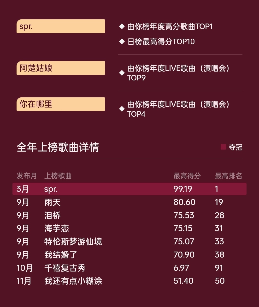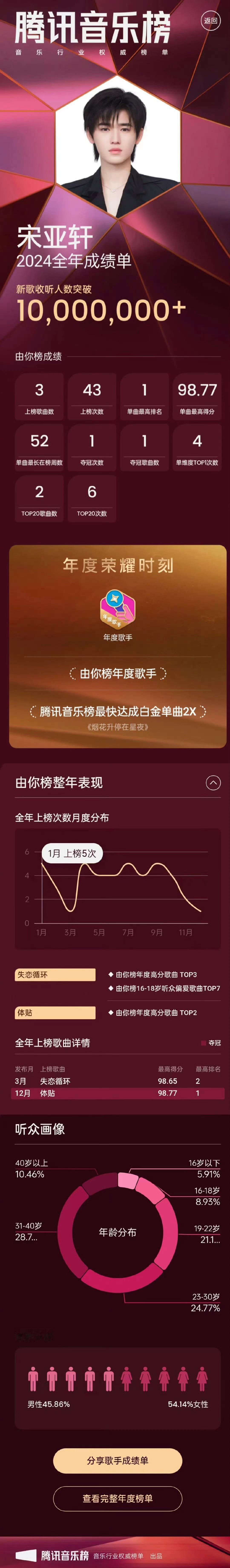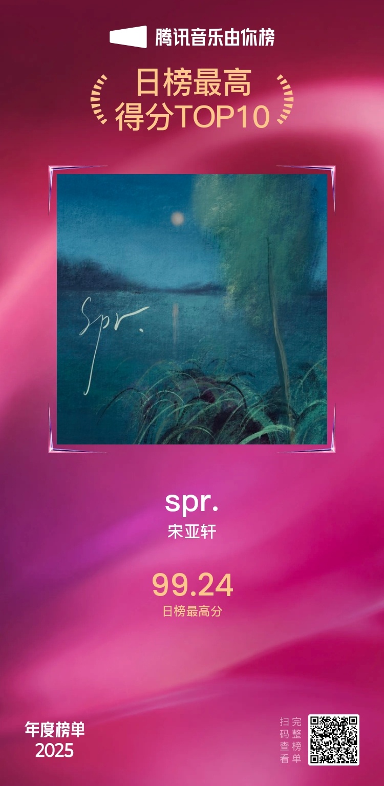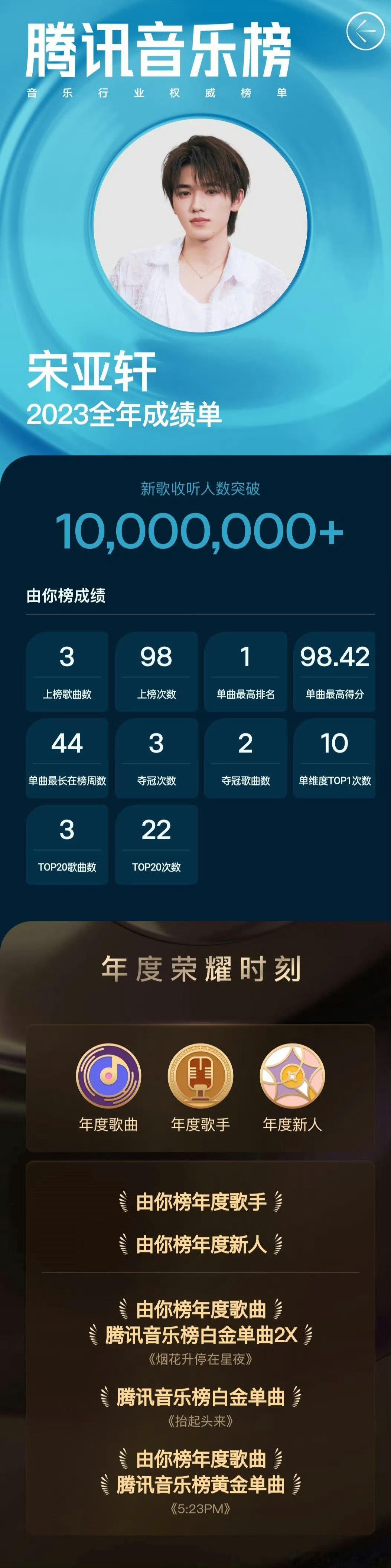 宋亚轩连续三年获得由你榜年度歌手宋亚轩✘腾讯音乐榜2025全年成绩单连续三年获得【由你榜年度歌手】荣誉!上榜歌曲9+上榜次数98+《spr.》年度单曲最高得分99.19&日榜最高得分TOP10&年度歌曲&最快达成白金/黄金单曲&累计/连续日冠次数最多单曲TOP10+《体贴》腾讯音乐榜黄金单曲!宋亚轩spr年度高分歌曲TOP1宋亚轩小男孩般的3秒