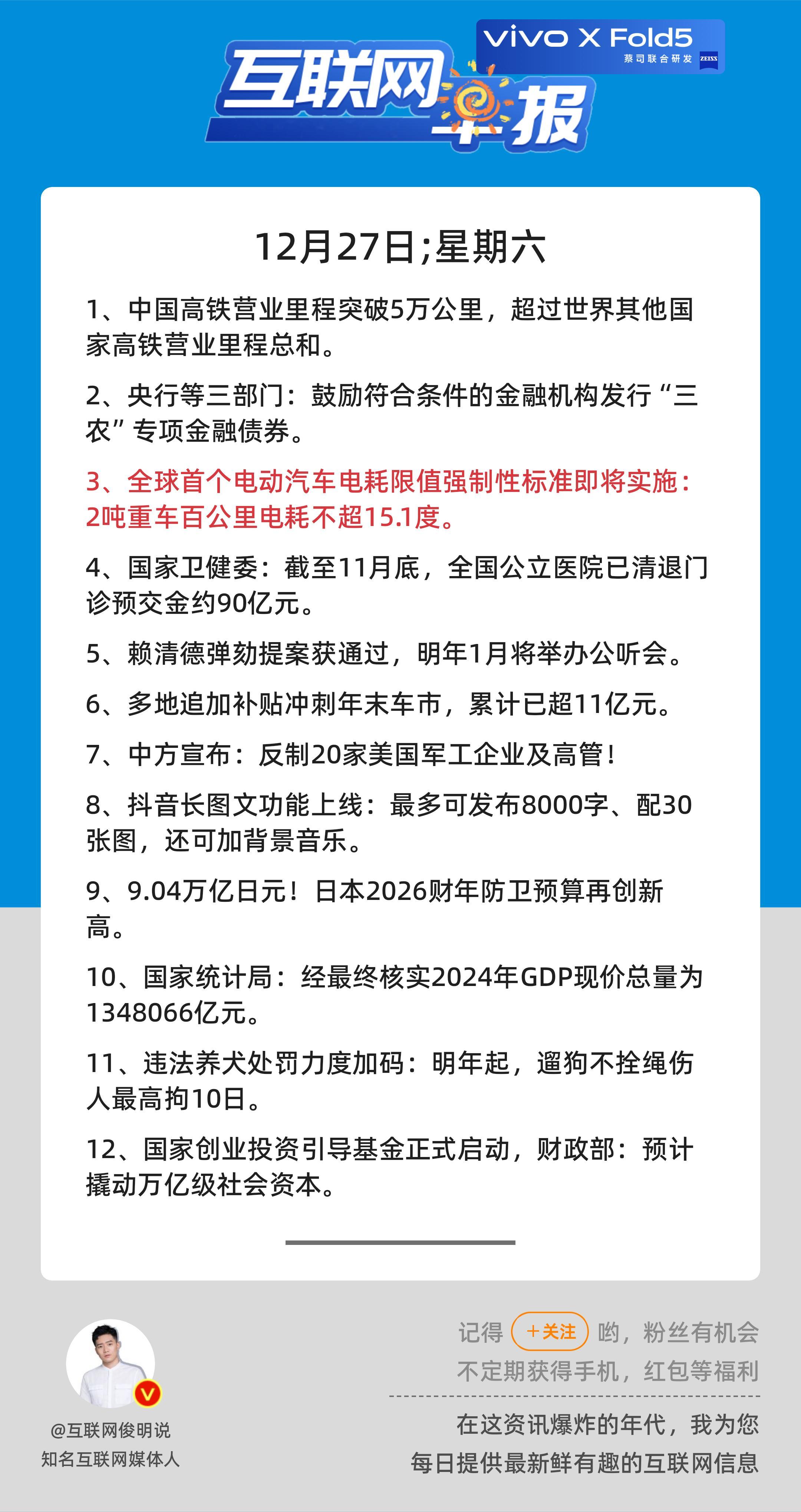 12月27日,星期六,《第3000期》;互联网早报,众览天下事关心第3条:全球首个电动汽车电耗限值强制性标准即将实施:2吨重车百公里电耗不超15.1度;早安————————————点击右上方关注每天一分钟众览天下事,互联网早报值得拥有! 更多精彩,欢迎加入粉丝群俊明和他的朋友们
