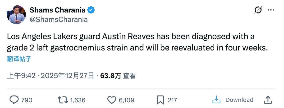 Shams:湖人后卫里夫斯左侧腓肠肌二级拉伤,至少将缺席约一个月,四周后再检查恢复情况。