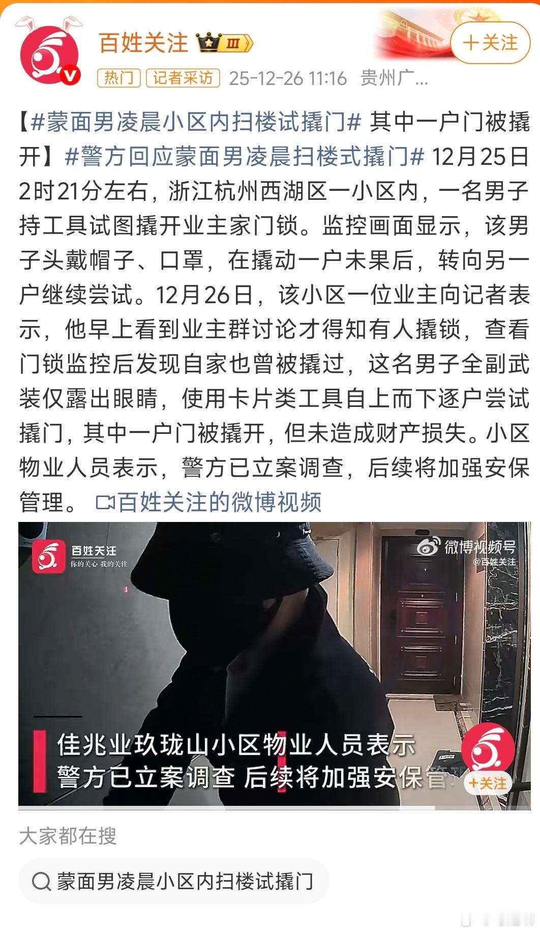 蒙面男凌晨小区内扫楼试撬门警方回应蒙面男凌晨扫楼式撬门 这贼的反侦查能力还挺强。不过,估计很快就会落网。