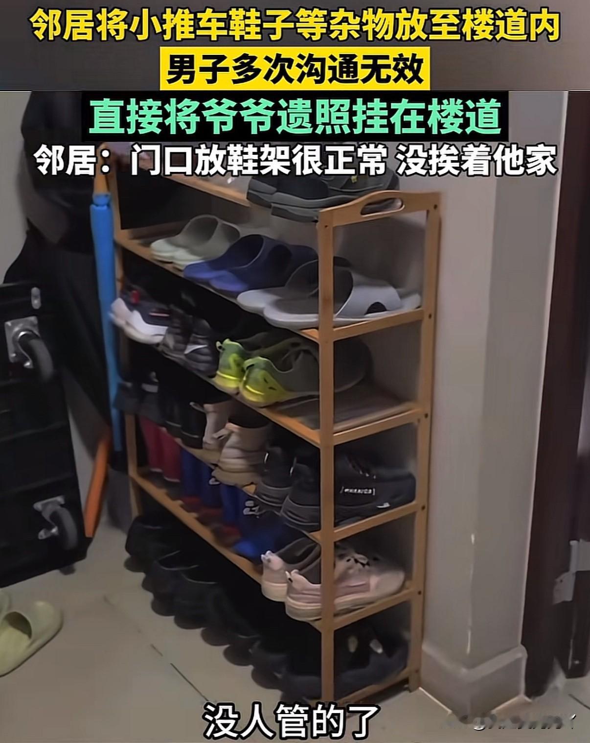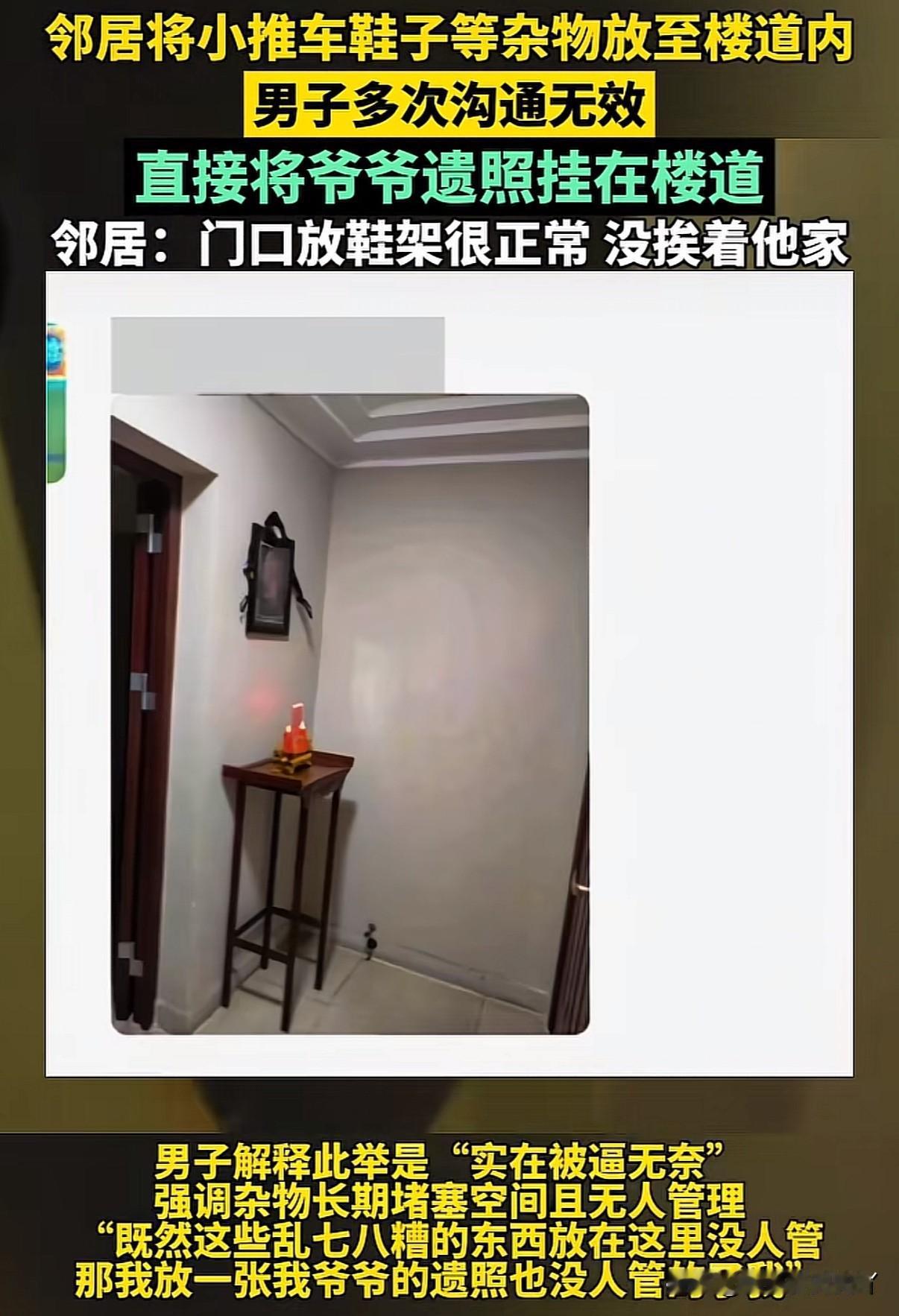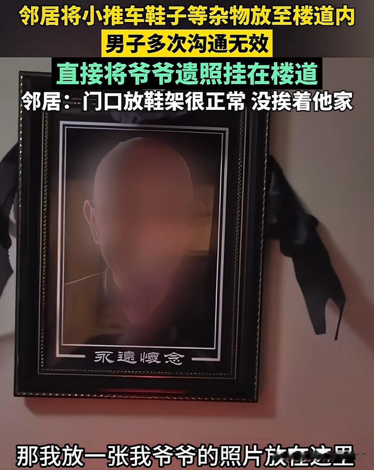 男子为整治对门邻居在门口放鞋架,搬出已过世的爷爷,将爷爷的遗像挂在门口楼道只一招邻居秒怂[捂脸] 近日湖南一男子邻居在门口摆放了一个鞋架还有一些杂物堆放在公共楼道,每天男子进出看到的就是一堆臭鞋子和杂物找邻居协商被无视后又多次找物业协商也没有解决问题,邻居表示我放在自家门口又没放你家门口别没事找事,楼道是公用的自己想放就放不服气你也可以把鞋架放外面 男子见说理是说不通了,于是也准备放点东西但不是鞋架跟杂物而是爷爷的遗像 男子先是挂了一副爷爷的遗像后感觉少点什么,然后又下单了供桌跟香炉和蜡烛,小灯一点氛围感直接拉满 男子这波操作直接把邻居整无语了,每天进出都能看到一张供桌还点着香烛还有墙上照片里陌生老人慈眉善目的微笑 但不得不说爷爷出面效果立竿见影,邻居立马撤掉鞋架还有杂物统统搬回家并主动找到男子希望能把遗像供桌也撤掉 事实证明邻里之间的矛盾谁讲理谁吃亏,讲理的时候费时费力还不一定能解决问题,而当你比对方更不讲理的时候问题却能迎刃而解