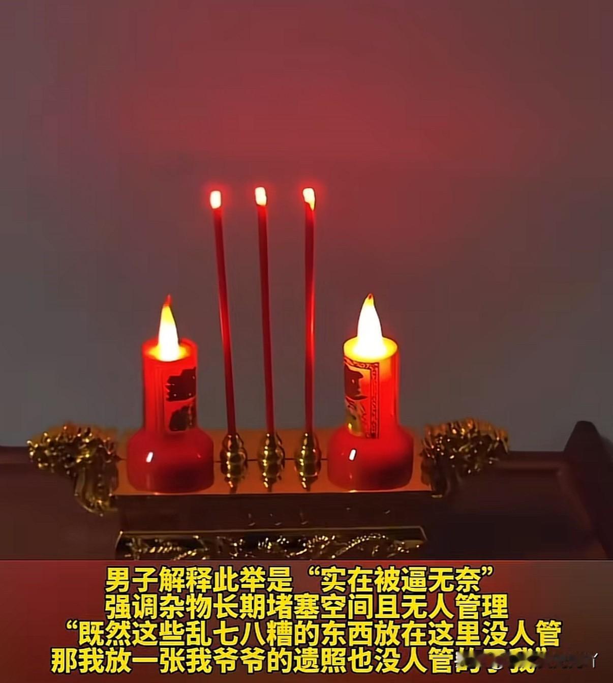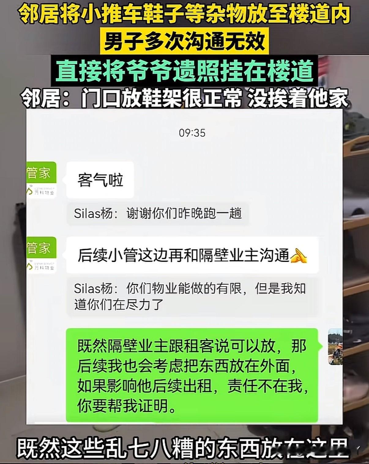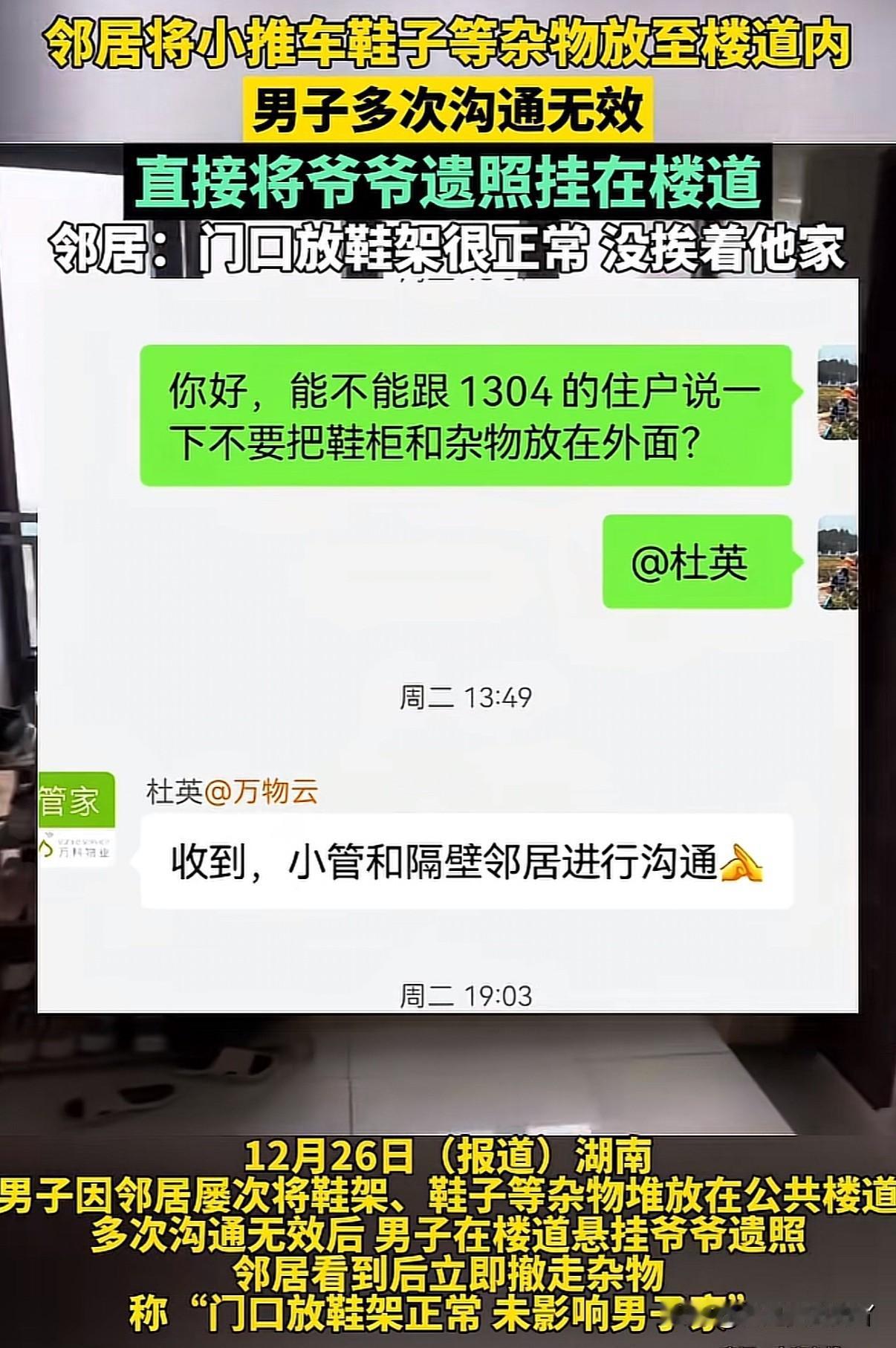 男子为整治对门邻居在门口放鞋架,搬出已过世的爷爷,将爷爷的遗像挂在门口楼道只一招邻居秒怂[捂脸] 近日湖南一男子邻居在门口摆放了一个鞋架还有一些杂物堆放在公共楼道,每天男子进出看到的就是一堆臭鞋子和杂物找邻居协商被无视后又多次找物业协商也没有解决问题,邻居表示我放在自家门口又没放你家门口别没事找事,楼道是公用的自己想放就放不服气你也可以把鞋架放外面 男子见说理是说不通了,于是也准备放点东西但不是鞋架跟杂物而是爷爷的遗像 男子先是挂了一副爷爷的遗像后感觉少点什么,然后又下单了供桌跟香炉和蜡烛,小灯一点氛围感直接拉满 男子这波操作直接把邻居整无语了,每天进出都能看到一张供桌还点着香烛还有墙上照片里陌生老人慈眉善目的微笑 但不得不说爷爷出面效果立竿见影,邻居立马撤掉鞋架还有杂物统统搬回家并主动找到男子希望能把遗像供桌也撤掉 事实证明邻里之间的矛盾谁讲理谁吃亏,讲理的时候费时费力还不一定能解决问题,而当你比对方更不讲理的时候问题却能迎刃而解