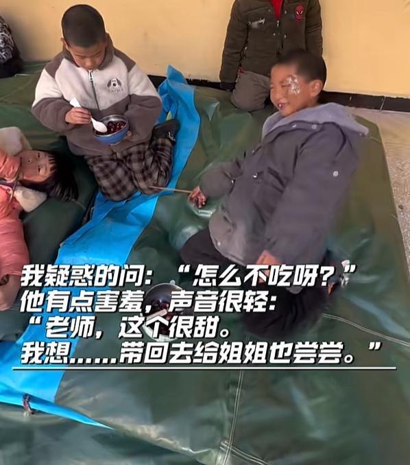 被一个孩子感动到了!近日河南,乡村小学的王老师在发工资们第一时间为班级里的留守儿童们买了一大箱车厘子,洗好后给买个小朋友都装了满满一大碗,小朋友们吃的很开心,可却有个孩子一颗都没有吃,老师问他原因,没想到听完后直接泪目了。 视频中,每个小朋友在见到车厘子时小眼睛的亮的发光,一刻不离的盯着它,王老师给每个学生都装了满满一碗,每个小朋友拿到车厘子后都像是获得了宝贝一般,有的和玩得好的同学一起分享,有的则是躲到角落里偷偷吃,几乎都吃的满嘴汤汁,可只有一个小男孩例外,竟然一颗都没有吃。 老师好奇地问为什么一颗都没有吃,男孩害羞的说:老师,这个很甜,我想......带回去给我姐姐尝尝,到了午休的时候,别的小朋友都趴在桌子上睡觉,只有男孩紧紧的抱着那碗车厘子,一刻都不想松手。 老师看到这一幕内心被狠狠的揪住了,男孩才二年级,在其他孩子都还在疯玩的年纪,居然有了超出年级的担当的责任,老师回到办公室,将自己那份车厘子装进了小瓶子里,偷偷的放进了男孩的书包中,想让男孩回家后能获得一份惊喜。 老师的举动也让不少网友泪目。 有的网友说:想起我的大学同学,来自河南新县,据她说应该是贫困县,她家因为父亲早逝的缘故更加贫困。她是我们班重点照顾对象,所有能领的补助全给她申请,奖学金也没同学和她争,尽量评最高的。我过生日请几个同学去吃麦当劳,她和我说第一次吃太好吃了。 还有的网友说:父母为了生活,把孩子留到家里,也是父母的无奈呀,不过这群孩子很幸运,遇到这么好的老师,为王老师点赞。 也有的网友说:老师不单单只是老师,更是这些孩子的指路明灯,教书是本职,育人才是更高的境界。 就像网友们说的,老师不单单只是老师,就像这位王老师,既是孩子们的老师在课堂上教授知识,又是孩子们生活上另一个父亲,给孩子们在家中感受不到的温暖,这份善良和温暖,不仅温暖了班级里每一个孩子,也温暖了每一个网友。 在孩子这个群体中,留守儿童是可怜的,感受不到父爱感受不到母爱,小小年纪就要帮助家里面干活,用瘦弱的肩膀扛起自己的童年时光,他们也像其他孩子一样,渴望家庭的温暖渴望父母的陪伴,希望像其他孩子一样能过一家人幸福美满的生活。 幸运的是,在我们的乡村中,依然还有很多老师用爱跟这些孩子们站在一起,用自己的工资来弥补孩子们家庭的缺陷,用自己的爱点亮每个孩子的人生,用肩膀托举每一个孩子让他们飞的更高,蜡炬成灰泪始干这句诗,在老师们的身上具象化了。 给所有的乡村老师点赞,给所有愿意用爱温暖这些孩子的老师们点赞,希望老师和孩子们以后都能越来越好,过上幸福美好的生活。 你怎么看?评论区说说吧。