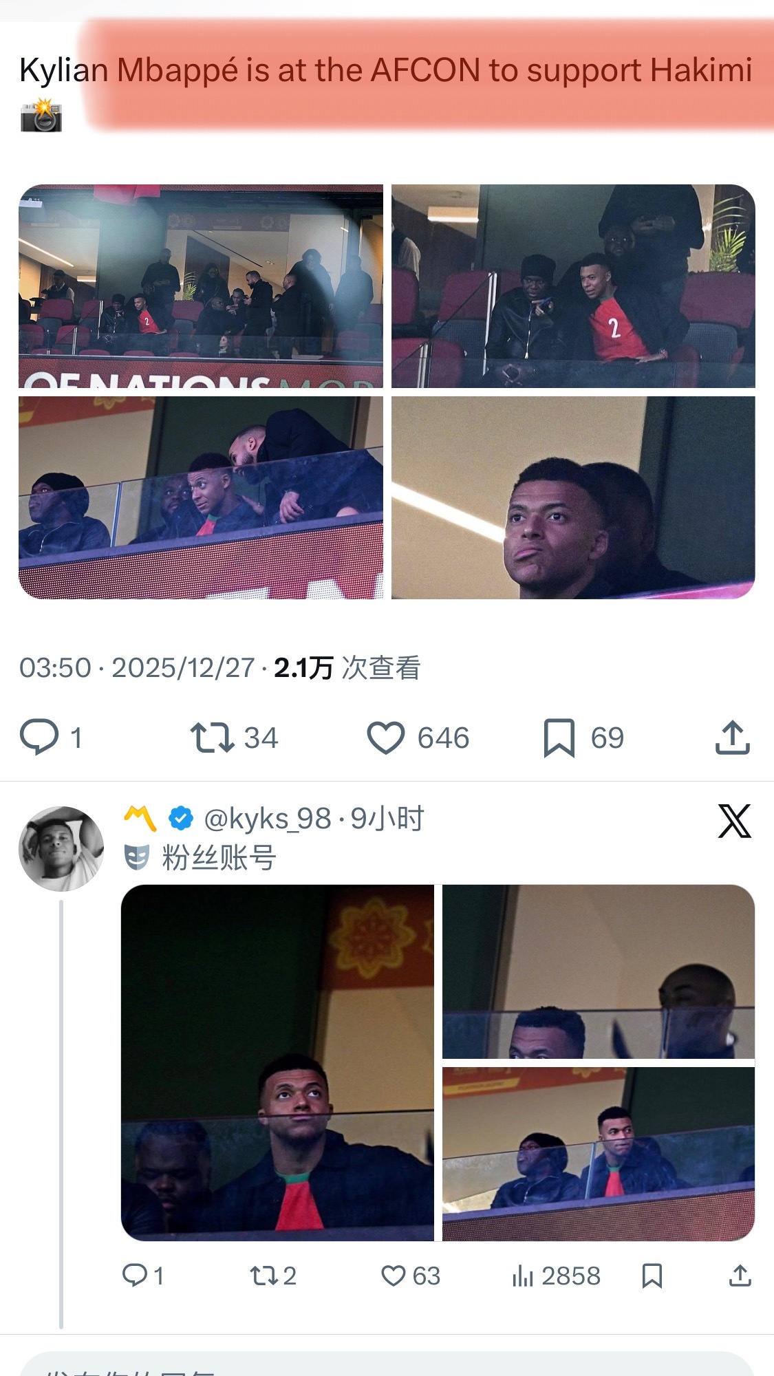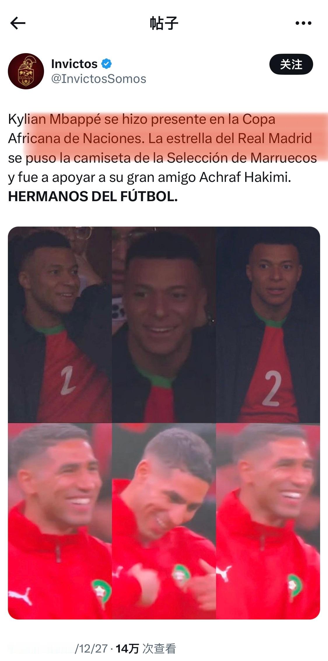 非洲杯 八佩穿着摩洛哥球衣到现场支持哈基米啊