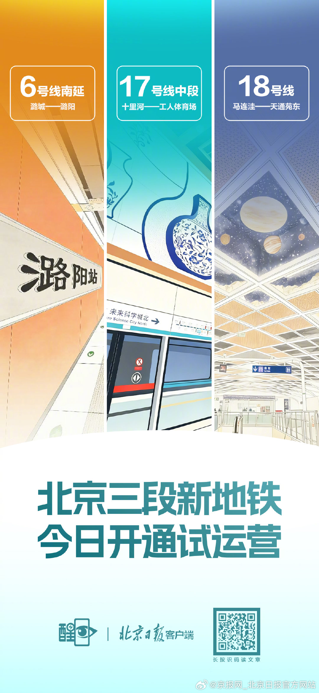 【#北京3段新地铁开通试运营#】#北京地铁已集齐1至19号线#记者从市交通委和市重大项目办获悉,2025年12月27日(今天)首班车起,地铁17号线中段(工人体育场—十里河)、18号线(马连洼—天通苑东)、6号线南延(潞城—潞阳)等3条(段)城市轨道交通新线开通试运营,新增运营里程约30公里。自此,北京城市轨道交通运营总里程已达到909公里,标志着首都轨道交通网络规模、服务能力与综合交通承载力迈上新台阶。此次开通的新线将新增城市北部东西向轨道交通廊道、打通东部南北向通勤大动脉、完善城市副中心交通配套,为回龙观、天通苑、北七家、潘家园、亦庄等大型居住区提供更加便利的公共交通选择,进一步加密中心城区线网、强化重点功能区连接、提升通勤效率,轨道交通的骨干作用将进一步凸显,对完善轨道交通网络、优化城市空间结构、缓解区域交通拥堵、服务沿线重点功能区发展具有重要意义。这也是本市持续构建以轨道交通为骨干、地面公交为支撑、多种出行方式为补充的综合交通体系的又一扎实进展。(记者 孙宏阳 潘之望 李博 王可心;美编 温辉 吴薇 关印)