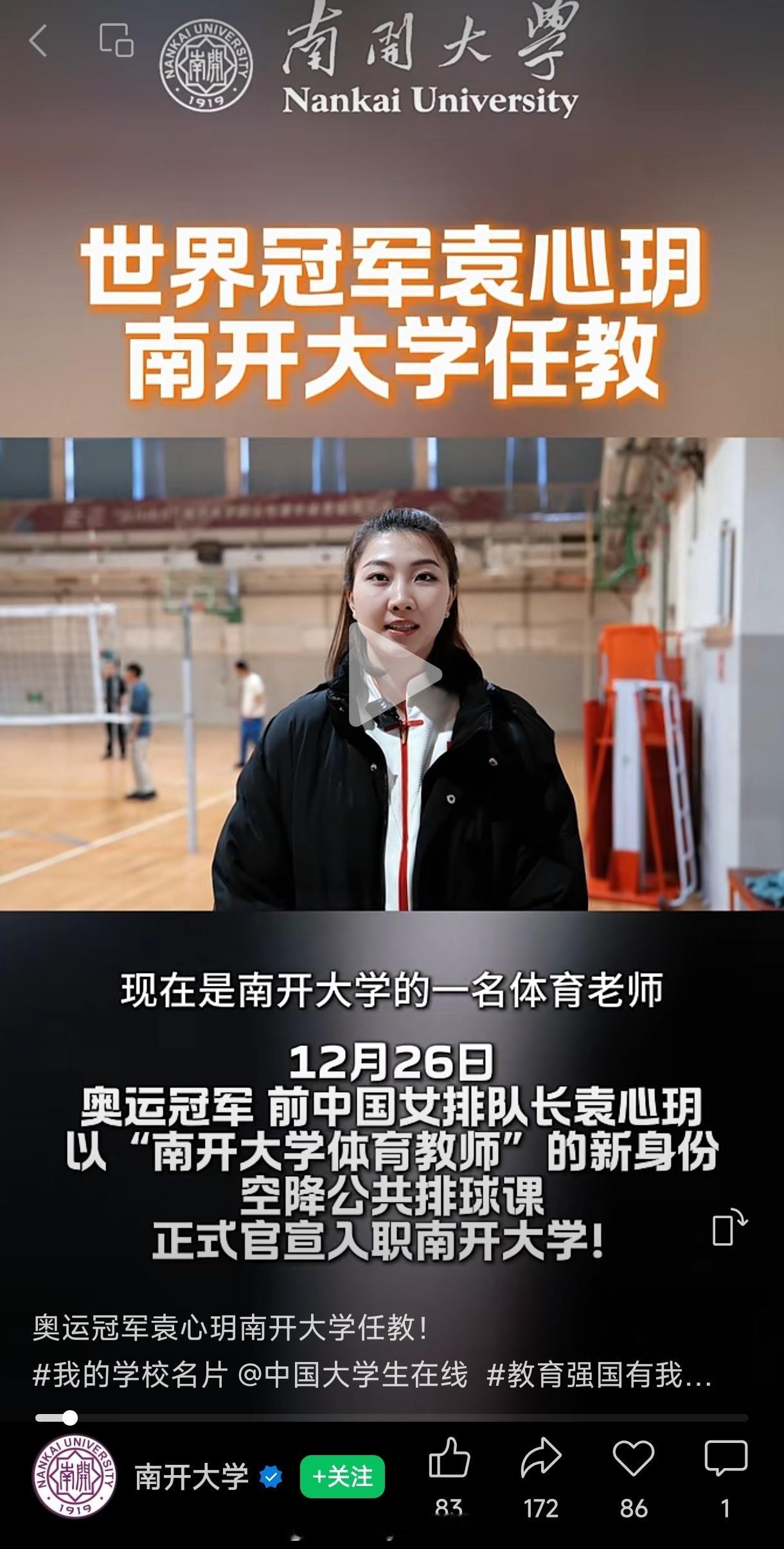 官宣!袁心玥正式入职南开大学,担任排球教师。我的感想是复杂的,首先肯定是祝福她,然后就是心里一大堆的问题,伤病怎样啦?严重不?为什么就突然不打了?上赛季土超不是还好好的么?中国女排奥运冠军袁心玥开启教师生涯