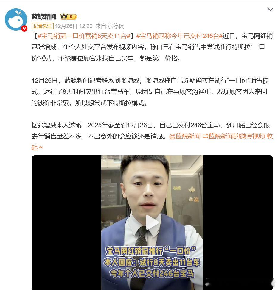 宝马这个销冠表示:自己在与顾客沟通中,发现顾客因为来回的谈价非常累,所以想尝试下特斯拉模式新势力对于传统车企冲击最大的就是这个“一口价”,不需要去跟销售斗心眼,对现在买车的年轻人来说真的很重要宝马销冠一口价营销8天卖11台