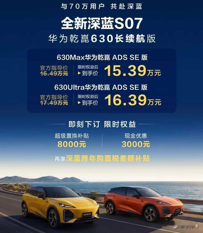 12月11日,深蓝S07华为乾崑630长续航版正式上市,起售价15.39万元。这个价格一出,确实吸引了不少人关注。全系标配华为智驾,车机芯片升级,还加了FSD可变阻尼减震器——这些变化,让这台2026款新车和今年2月上市的2025款比起来,显得更有看头。 2025款的深蓝S07提供深蓝自研智驾和华为智驾两种选择,而新款则统一用上了华为的方案。虽然入门版搭载的是华为乾崑智驾ADS SE,不算最强版本,但结合15万出头的价格,整体性价比还是相当扎实。华为在智驾领域的实力有目共睹,这次全系标配,无疑让S07在同类车型中多了几分吸引力。 关于底盘,长安系一直有些争议,常被拿来讨论。这次2026款全系标配了FSD可变阻尼减震器和HRS液压回弹制动器,理论上对刹车点头、过弯侧倾和路面颠簸会有改善,实际开起来是否更稳、更舒服,还得真正上路才能知道。 车机芯片从老款的8155升级到了8295P,算力和流畅度应该会明显提升。现在车子越来越智能,车机反应快不快、语音灵不灵,直接关系到每天用车的心情。 这次上市,官方给的权益也算实在:直接减3000元,15.39万就是优惠后的价格;置换再补5000;试驾还送高阶智驾包和泊车无忧包。三电和增程系统终身质保,每年还有一次免费深度检测,这些对车主来说都是实实在在的保障。 当然,车无完车。深蓝S07的整车质保期是三年或十二万公里,如果你打算开得久一点,可能就会考虑要不要加购终身质保包——纯电版5000元,增程版7000元。 设计上它延续了长安系的一贯风格,全系没有传统仪表盘,用HUD抬头显示代替。习惯看仪表的用户可能需要适应一下,建议试驾时特意感受一下HUD的信息布局和清晰度。 电池方面,增程版的中低配会混用宁德时代和中创新航的电池,增程高配和纯电版则全是宁德时代。虽然不是全系统一,但中创新航的电池也属主流水平。 充电速度上,全系增程和纯电都是3C充电。对增程来说够用,但对纯电车型来说,这个规格在当前市场里算是中规中矩。如今有些同价位的纯电SUV已经做到5C充电,速度更快,比如优惠后不到15万的极氪某款车型,这方面就显得更有优势。 总的来说,深蓝S07 2026款在核心配置和购车权益上挺有诚意,尤其是增程低配,日常使用完全足够,性价比相对突出。当然,选车时还是要结合自己的实际需要,看看它的优点是不是你在意的,有些细节是否能够接受。车终究是开给自己用的,合适最重要。