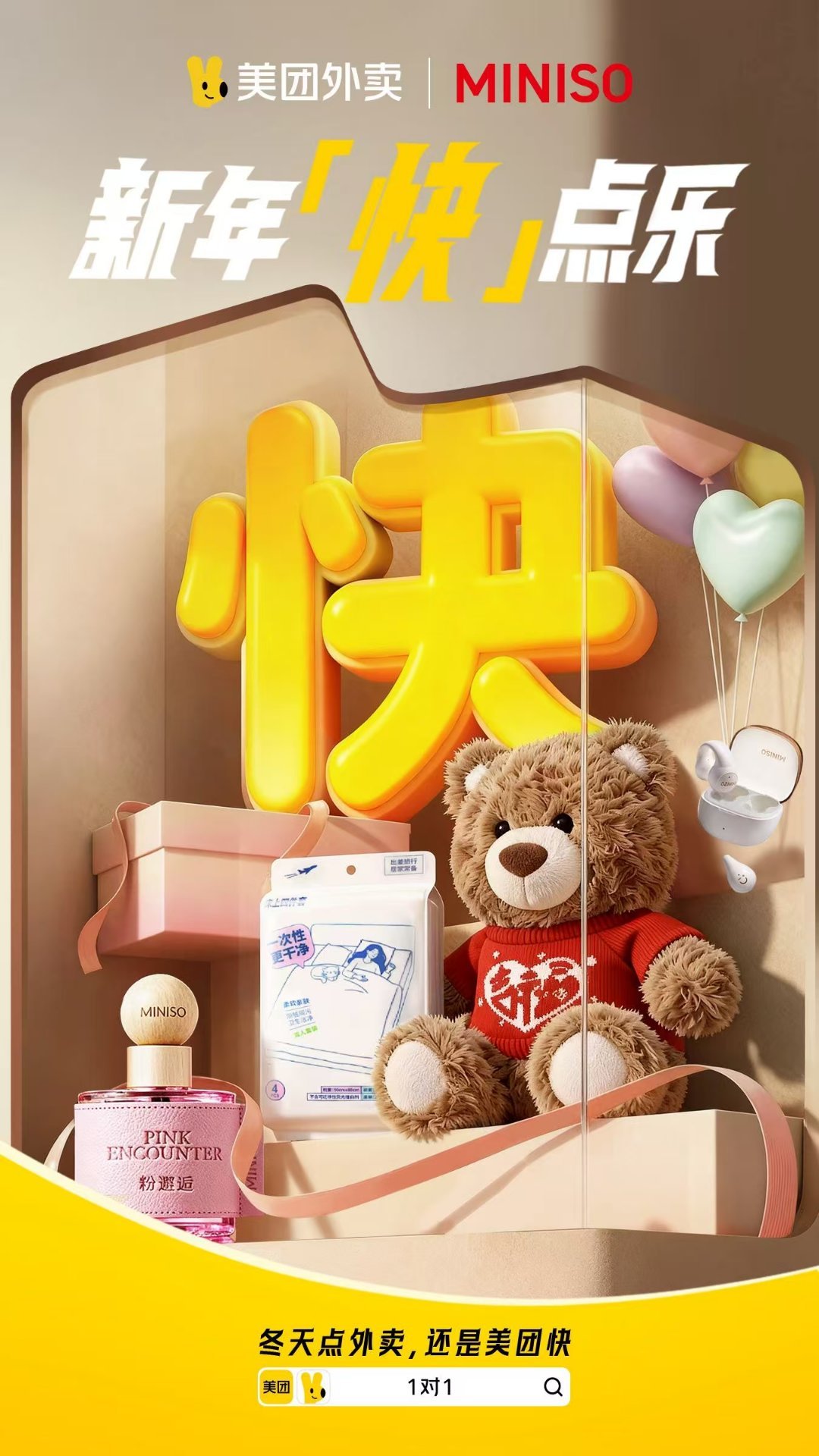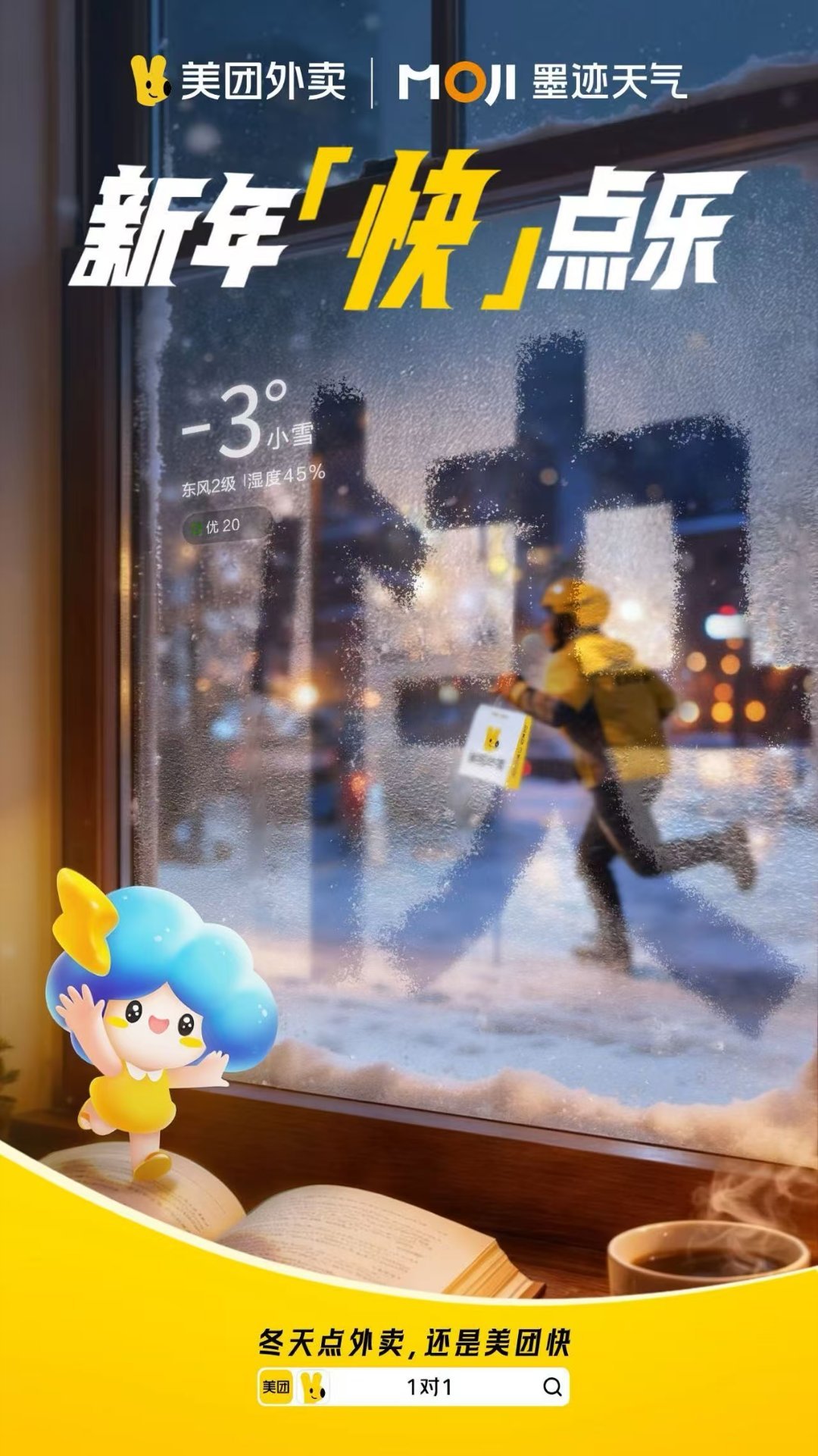 美团外卖祝你新年快点乐天冷懒得动,点美团外卖是真快!刚付款没多久小哥就敲门,热乎饭菜捧手里超暖~快不只是速度,更是冬日里的小踏实!周董代言福利接力超给力,大牌好礼扎堆送,接住这份新年快乐呀~冬天点外卖还是美团快
