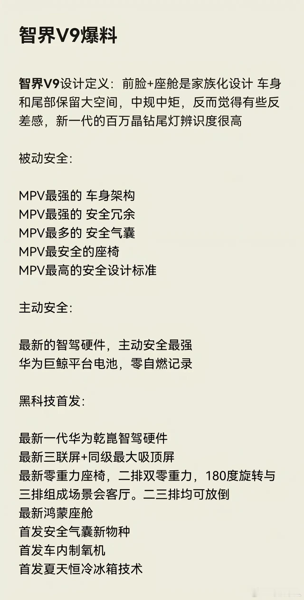 鸿蒙智行首款MPV智界V9实车曝光鸿蒙智行首款 MPV 智界 V9 实车谍照和一些信息透露出来了!5米3的车长,超过3.2米的轴距,支持支持高速 L3 级智驾与全场景自动泊车,所有你能想到的配置肯定是都拉到顶了,明年开春的重头戏,腾势 D9、极氪 009、理想 MEGA 压力山大......