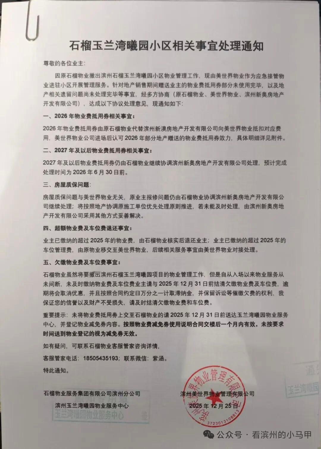 滨州一小区新旧物业联合发声 前情回顾(可搜索):滨州又一小区物业主动撤场 滨州一开发商承诺成“空头支票” 进展: 2025年12月27日,山东滨州滨城区石榴玉兰湾曦园现美世界、原石榴两物业联合发通知,美世界为应急接管物业。 主要内容如下: 滨州石榴玉兰湾曦园新旧物业联合公告,美世界应急接管,明确开发商赠物业费抵用券、质保等遗留问题处置方案。 2026抵用券有效由石榴物业代结,2027+抵用券2026.6.30前办结;超2025物业费退业主、车位费移交,欠费需12.31前结清。 未登记抵用券12.31前交物业,逾期无效;房屋质保与新物业无关,此次交接为同类小区物业交接提供参考。 具体内容见下图
