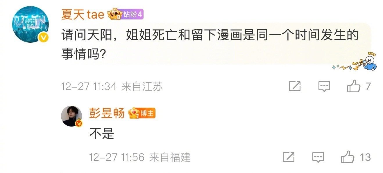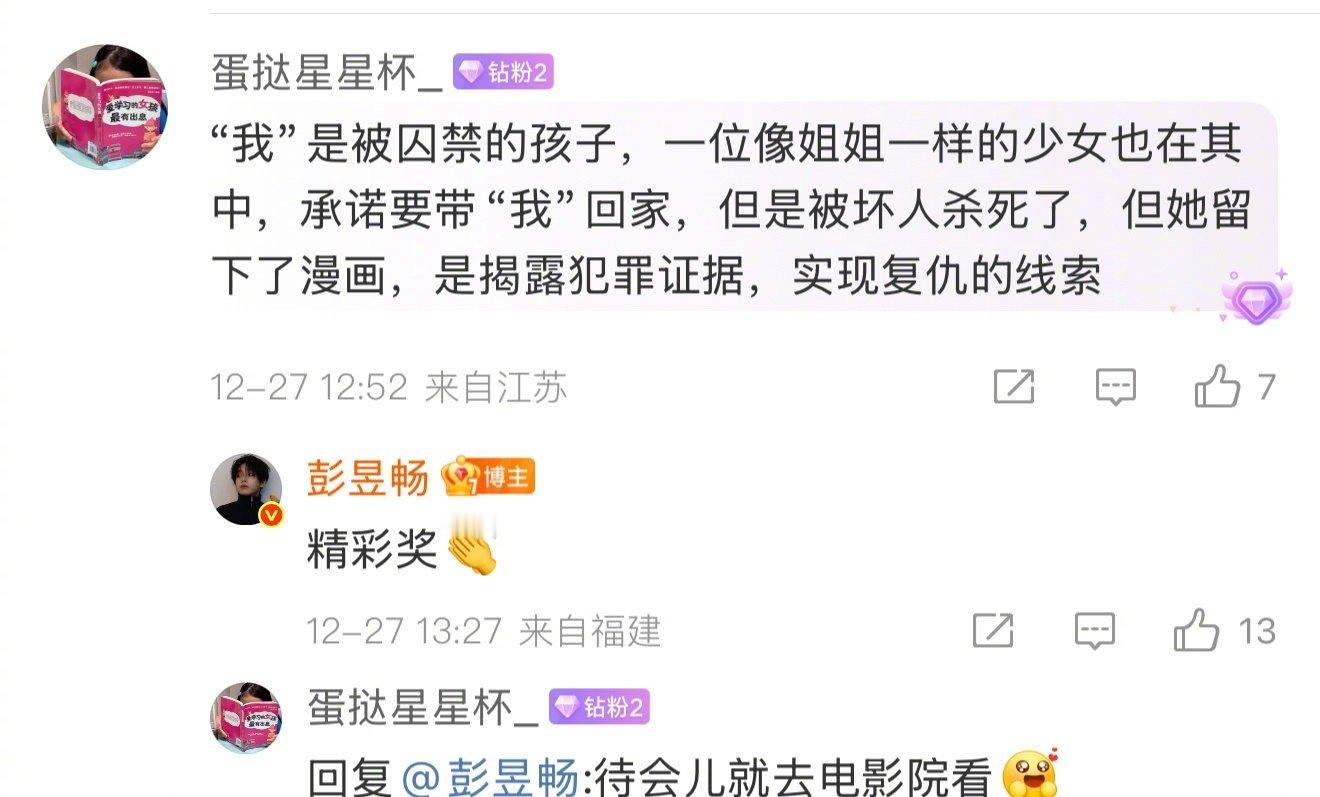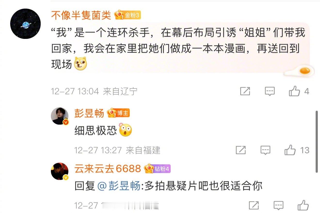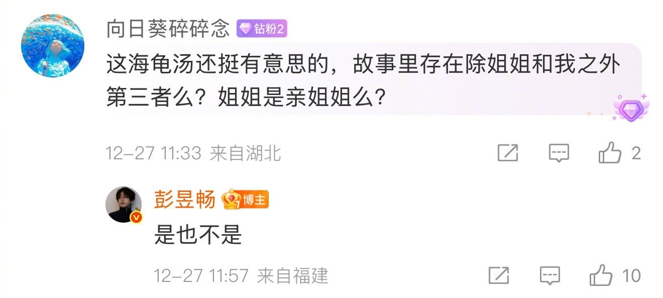 彭昱畅评论区细思极恐粗思更恐 彭昱畅这波悬疑营销太会了!借着《匿杀》宣传发起“姐姐死了只留一本漫画”的海龟汤,一个简单的汤面瞬间点燃评论区。粉丝们化身侦探,从“被囚禁的孩子”猜到“姐姐被做成漫画”“漫画是犯罪证据”…彭昱畅亲自下场互动,真真假假让人上头,这波互动式悬念我给满分!