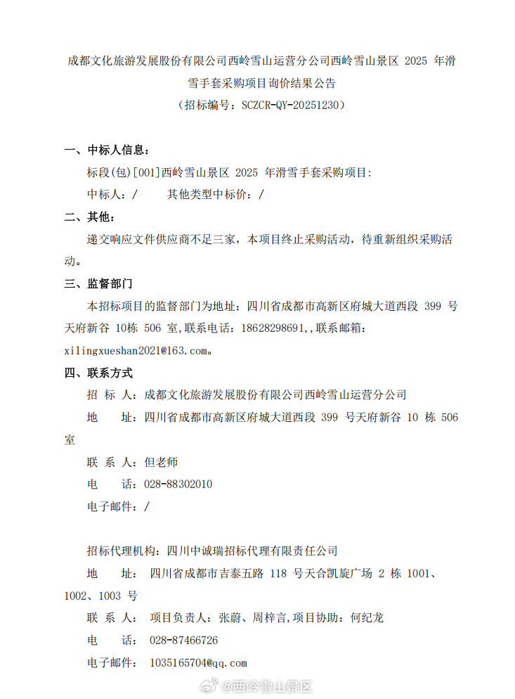 成都文化旅游发展股份有限公司西岭雪山运营分公司西岭雪山景区2025年滑雪手套采购项目询价结果公告