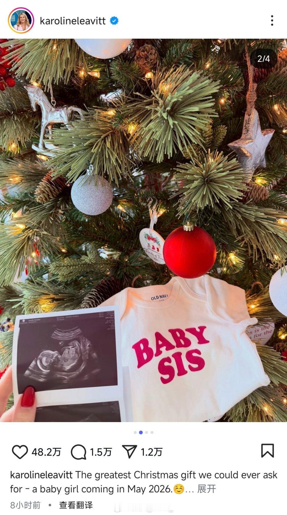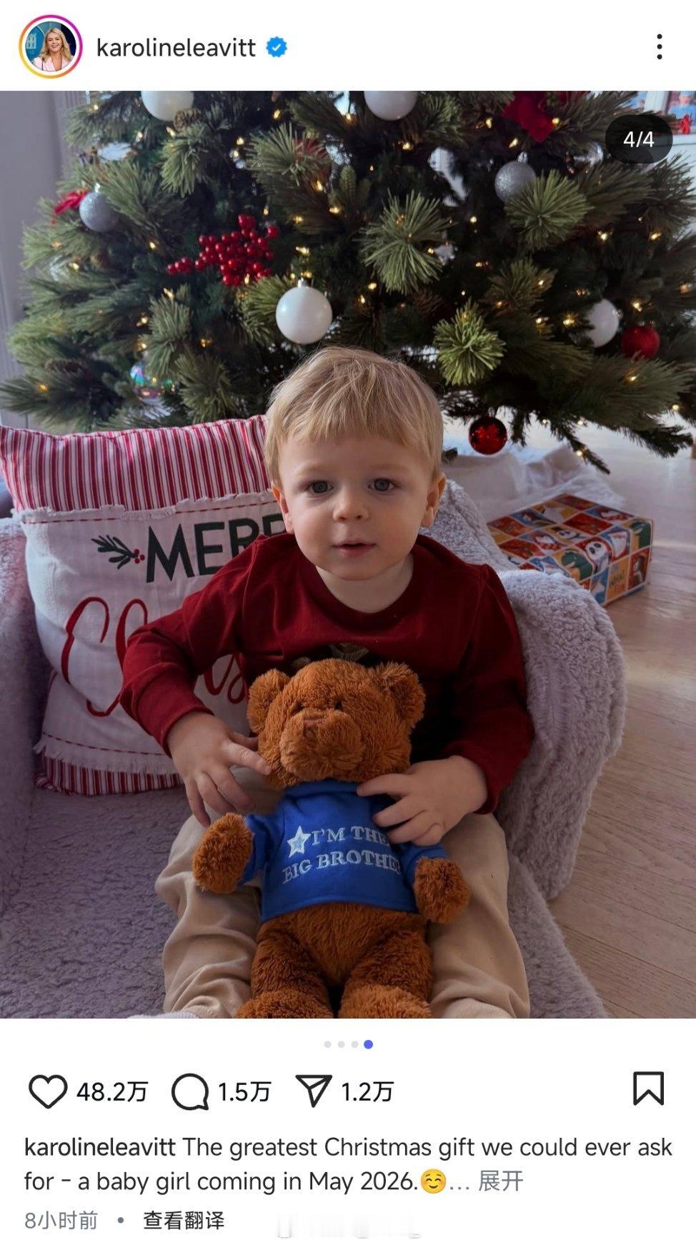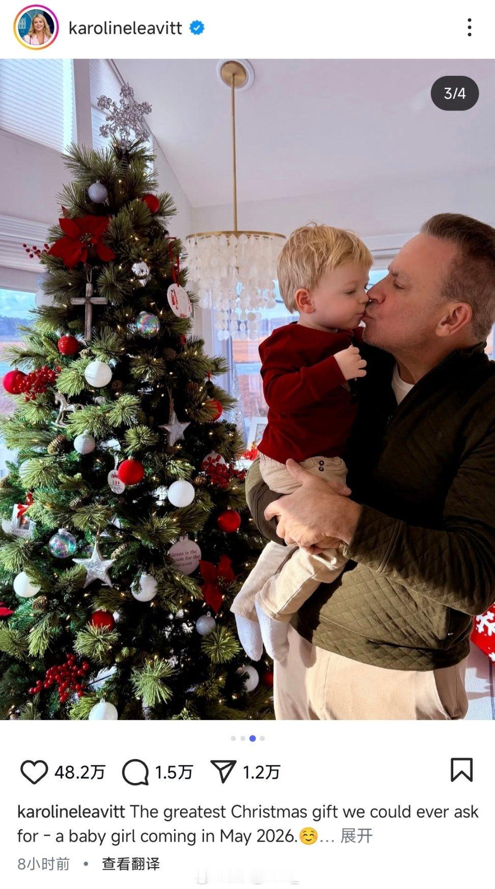 白宫发言人莱维特26日宣布,她和丈夫即将迎来他们的第二个孩子——一个女婴,预产期是明年5月。她在社交媒体Instagram上发布了照片,照片中她挺着孕肚站在圣诞树前。她还写道:“我和丈夫非常激动地期待着家庭的壮大,迫不及待地想看到儿子成为哥哥。我由衷地感谢上帝赐予我为人母的恩赐,我真心相信这是人间天堂。”