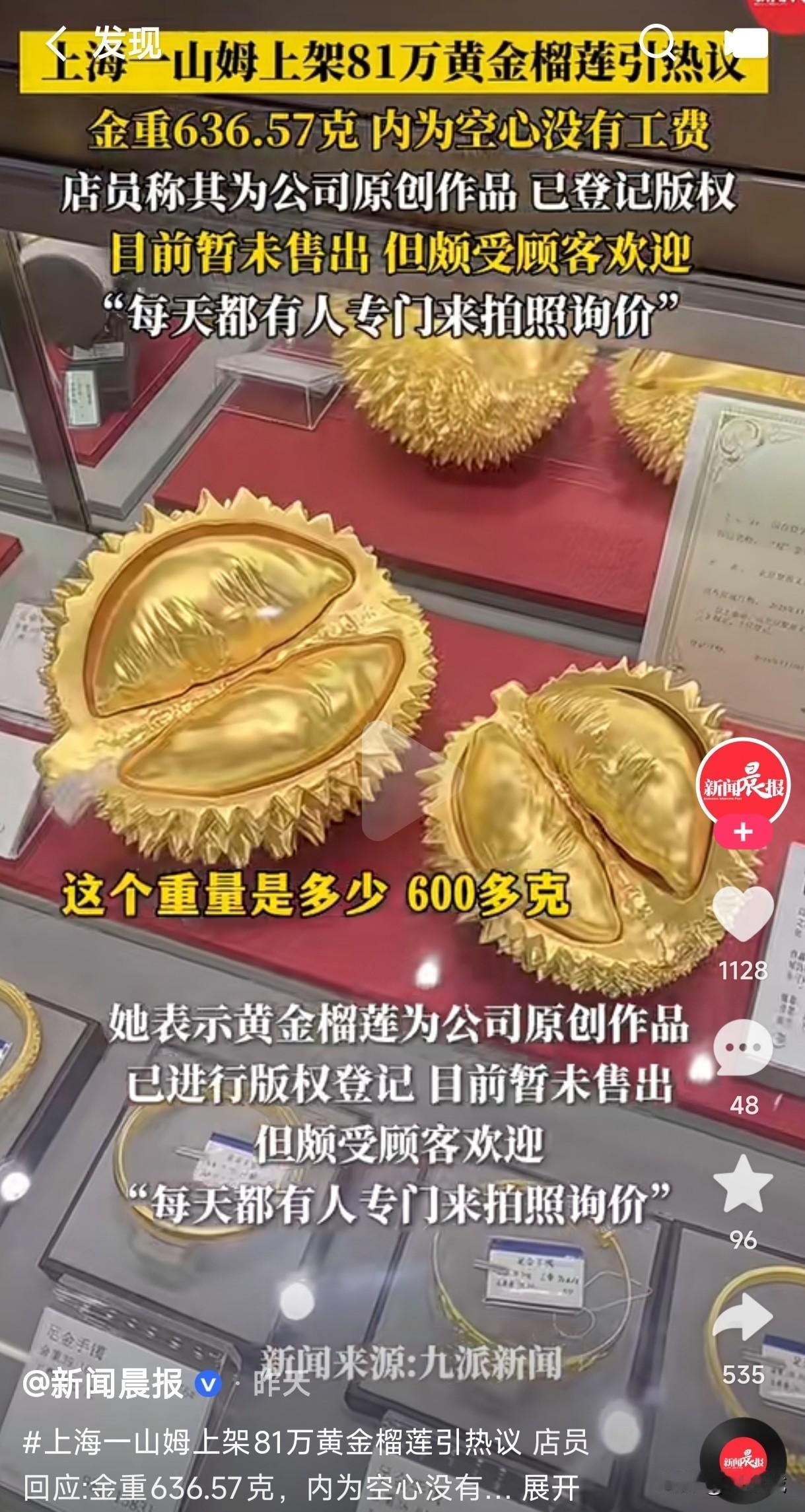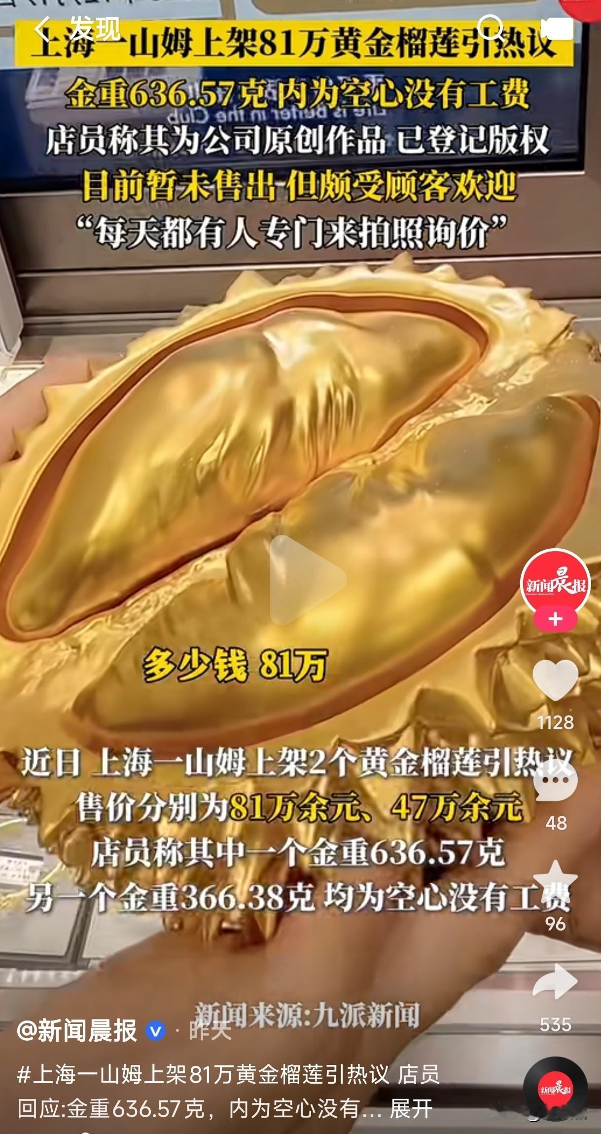 活了几十年了,吃过的榴莲用手指头掰着都能数清楚,这上海一山姆上架2个黄金榴莲,一个81万多,一个47万多。 这黄金榴莲还是第一次见,这做工是不是太完美了,让人看着都眼馋羡慕,市面上卖的食品级榴莲一般普通人都吃不起,这商家突然上架一对黄金榴莲,这是不是直接客源不断,每天都有人拍照询价,这得亏是空心的,如果是实心的那还了得,真是做梦都没有想到居然还有黄金榴莲?