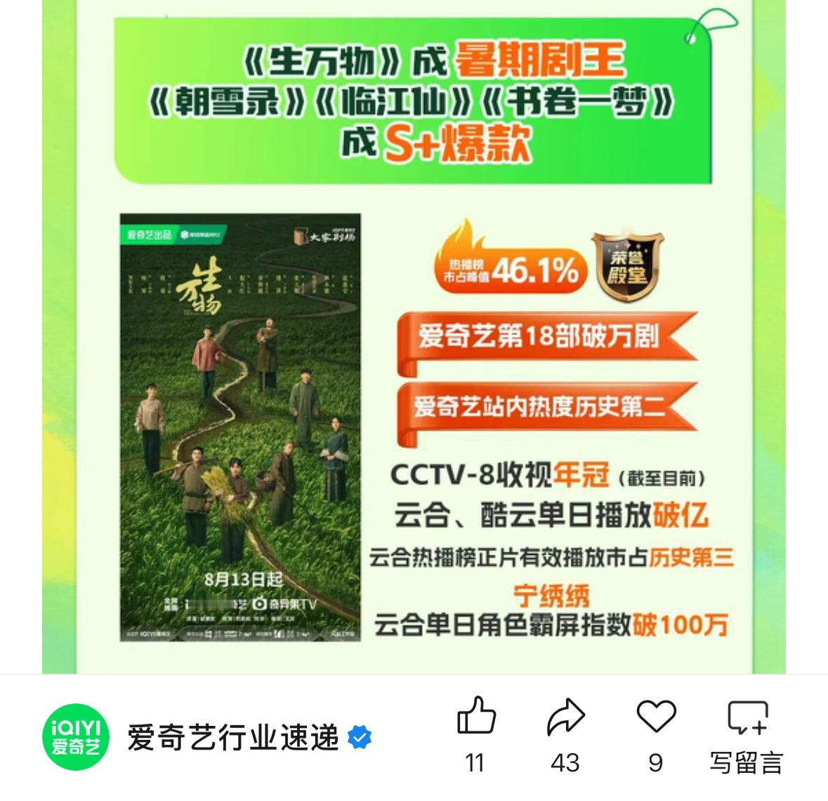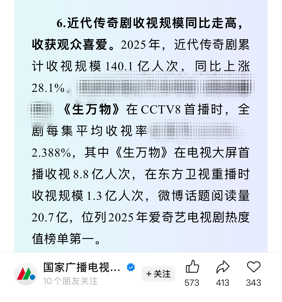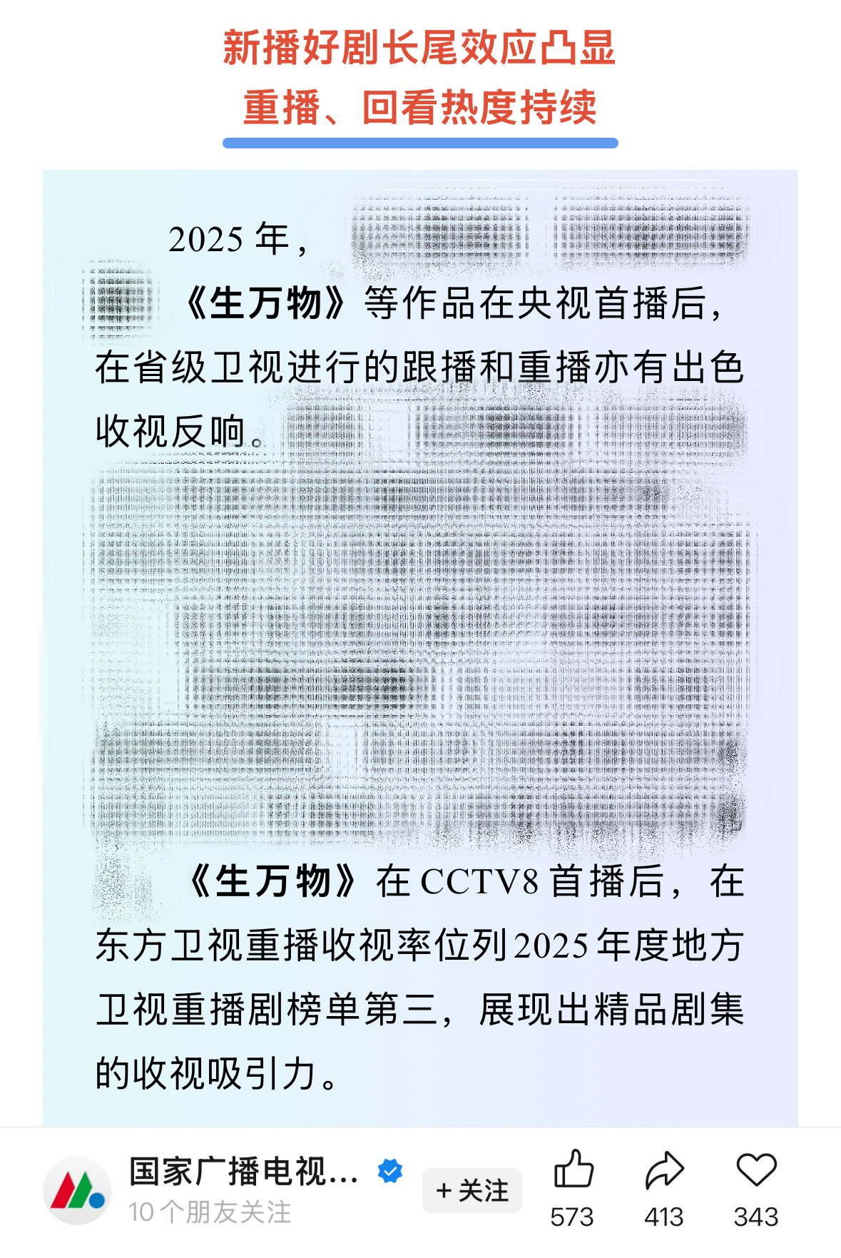 广电认证四大年冠 2025,那当然是杨幂《生万物》啦首播收视优秀、重播热度持续、展现了精品剧集的收视吸引力微博爆剧认证🌾云合爆剧认证🌾酷云爆剧认证🌾抖年度爆款认证🌾爱奇艺爆款认证🌾爱奇艺、南都娱乐以“生万物”衍生句式做2025的总结与2026的展望