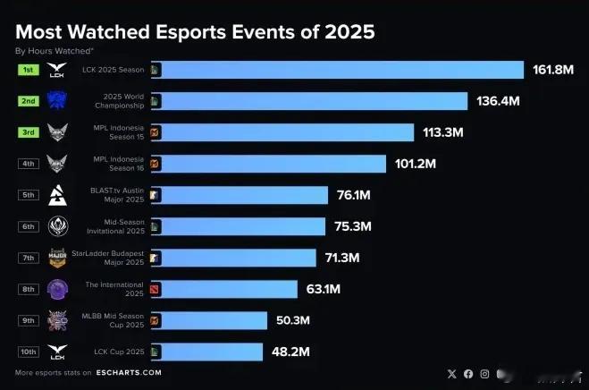 2025年观看量最多的电竞赛事出炉,LOL的LCK赛第一,TI排在了第八,这个数据没有统计国内的数据LOLdota2