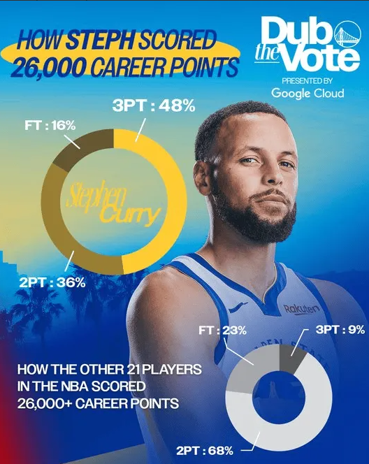 昨日NBA圣诞大战,勇士主场迎战独行侠。 比赛进行到第四节,勇士后卫斯蒂芬-库里已经拿到12分。 至此,库里生涯常规赛总得分已经突破26000分。 今日,勇士官方晒出库里26000分的组成:三分48%、两分36%、罚球16%。 “仅有22名球员曾突破26,000分大关。 斯蒂芬以自己的方式加入了这个俱乐部👏”