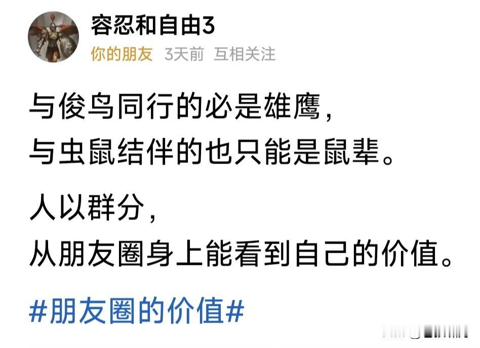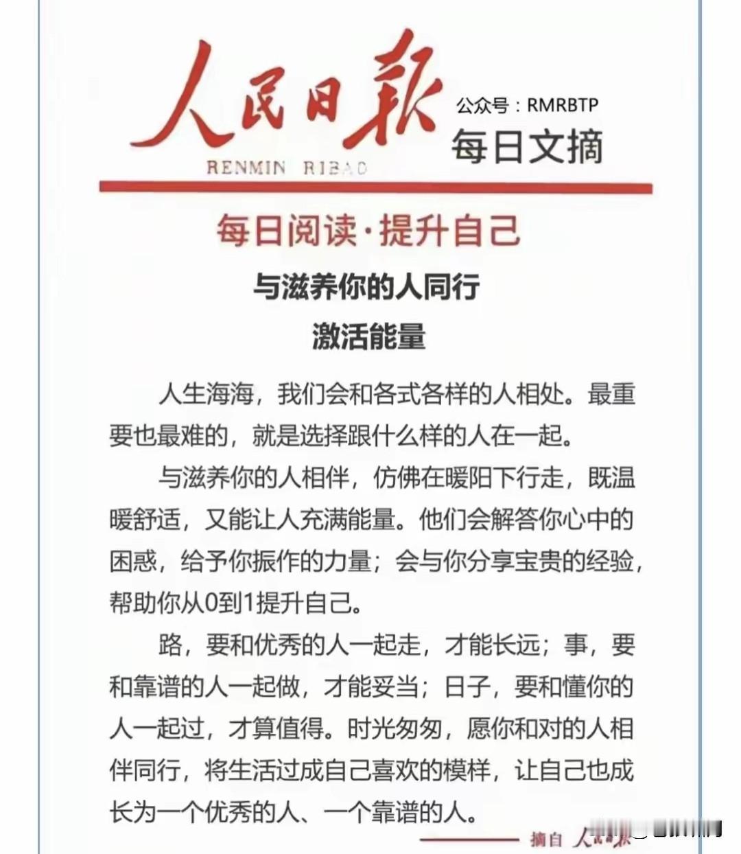人民日报金句:与凤凰同飞必是俊鸟,和虎狼同行必是野兽!世事苍茫,我们无法选择与什么人在一起,但可以选择与凤凰同飞,与虎狼保持距离! 欲成大树,莫与草争。将军有剑,不斩苍蝇!遇到烂人及时止损,遇到烂事及时抽身。人生匆匆,自渡是一种不凡能力,助人更是一种超人的格局! 路,要和优秀的人一起走,才能长远;事,要和靠谱的人一起做,才能妥当!日子,要和懂你的人一起过,此生才算值得。你会成为优秀靠谱的人! 不得不服,人民日报的“金句文摘”,说得实在是好!这些话说的不仅是工作与生活,指导我们为人处世的法宝,即使放到国际交往,不也是这样吗? …………