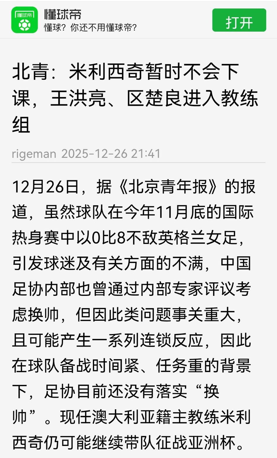呵呵,常卫巍等了两周也没等到去女国足上课的通知。现在《北京青年报》又说足协不让米利西奇下课,只让王洪亮和区楚良驰援女足,老常和武汉江大女足是被耍了么? 半个月前,就是这家媒体打头,众多媒体一齐爆料:足坛上下内外都对米利西奇不服,武汉女足主卫巍力压陈婉婷,成为接手国家女足帅印的唯一人物。 老常当时正带武汉队在摩洛哥征战世俱杯,其心理波澜可想而知,武汉女足果然在第二天的比赛1:2告负,就此在世俱杯止步。虽然没必要就输球甩锅,但没面的老常内心真有难言之苦。