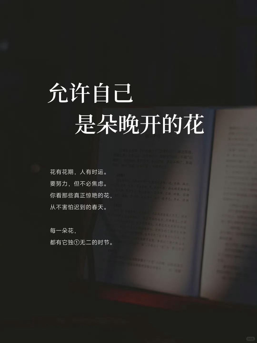 每一朵花都有它独一无二的时节,允许自己是朵晚开的花。 春兰不语,自有清香 秋菊不争,亦成风景 花有花期,人有时运 要努力,但不必焦虑