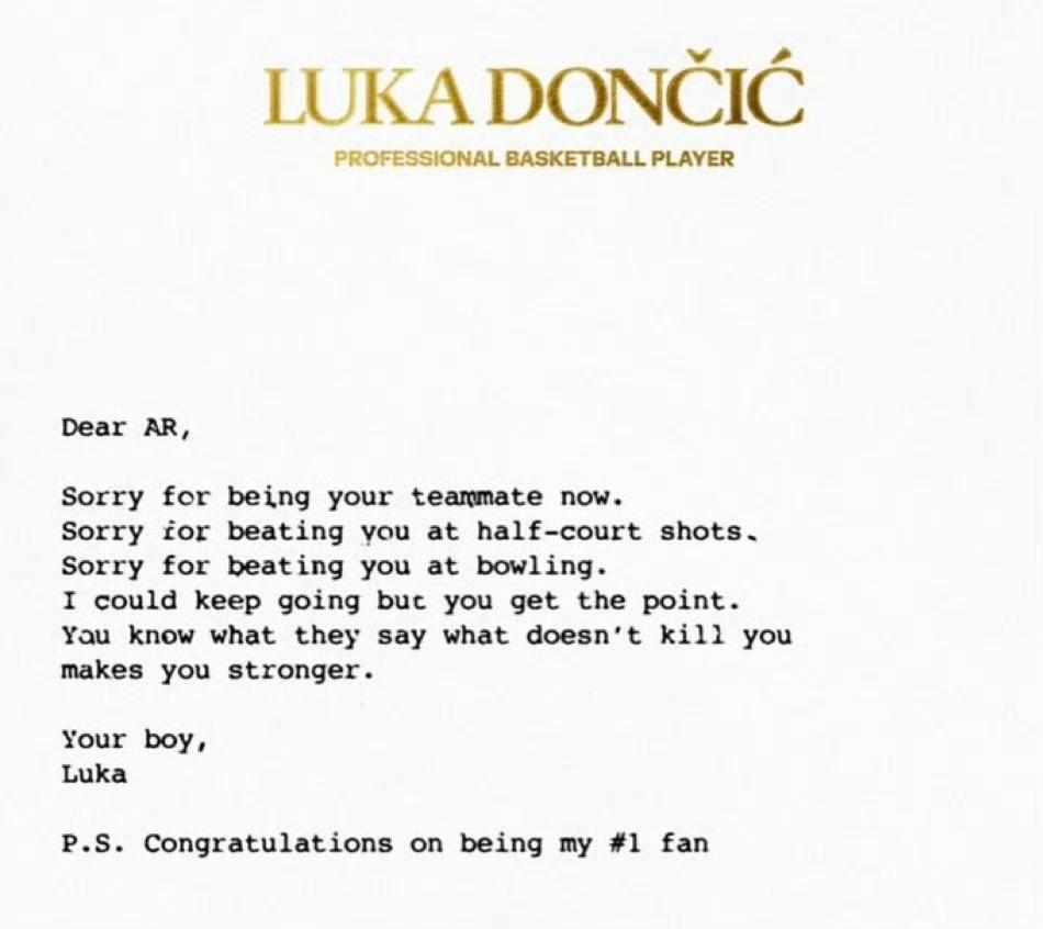 东契奇写给里夫斯的一封信 亲爱的AR: 抱歉现在成了你的队友。 抱歉在半场投篮比赛里赢了你。 抱歉在保龄球上赢了你。 我还能接着说,但你懂我的意思。 俗话说,那些打不倒你的,会让你更强大。 你的兄弟 卢卡 附:恭喜你成为我的头号粉丝😅