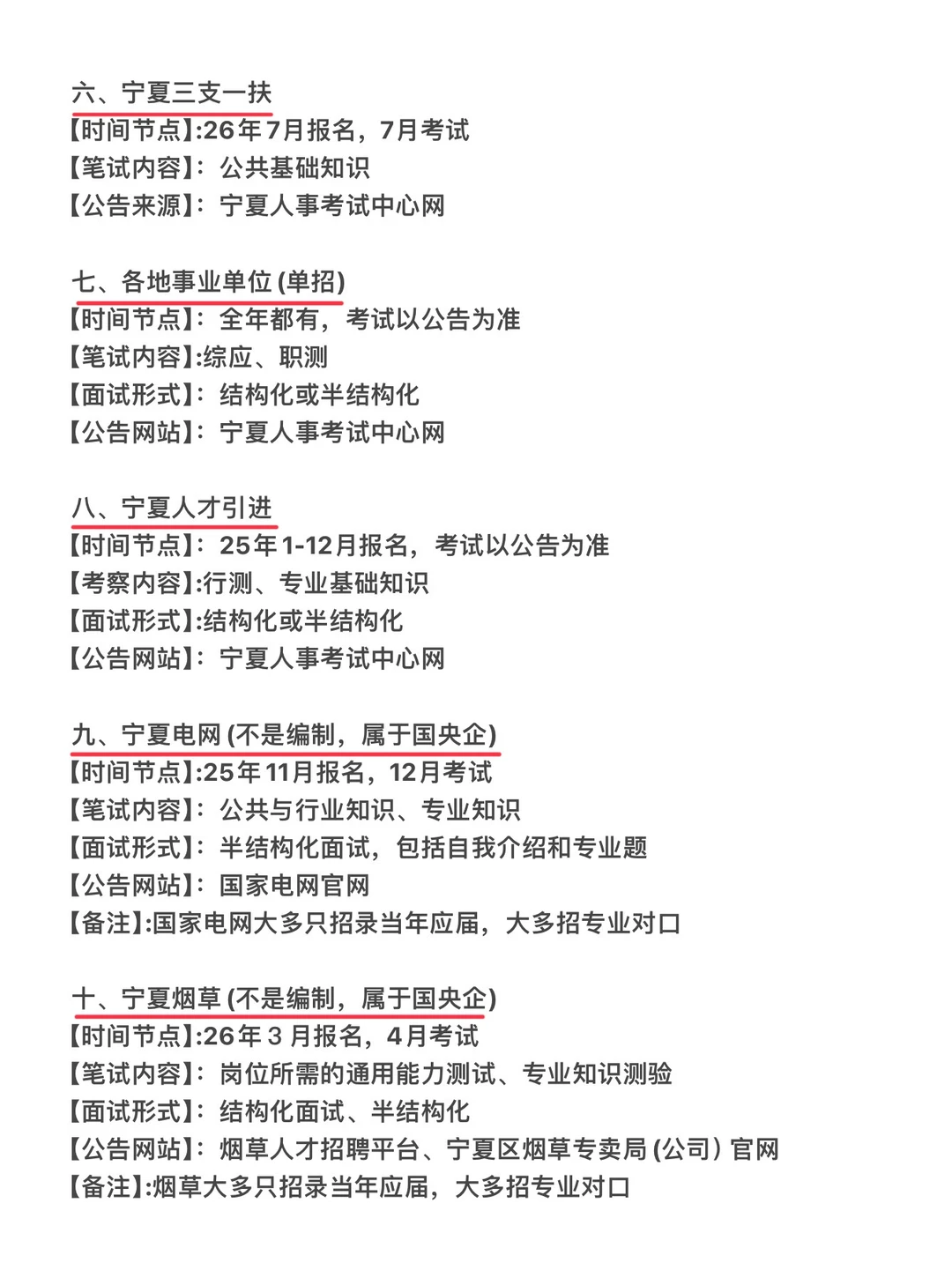 不是 你们宁夏同学真的没事干吗... 宁夏的考生完全可以冲一下体制内!这么多上岸的机会,从现在开始用心备考,真的不难! 一、为什么建议考宁夏公务员? 1、竞争压力相对较小:宁夏地处西北,这使得宁夏公务员考试的竞争压力比一些发达地区小。 2、薪资待遇有保障 :宁夏公务员享有完善的福利待遇,包括医疗保险、养老金、带薪休假等。 3、职业发展空间广阔 :宁夏加大面向基层选拔使用力度,使基层公务员职业发展空间更加宽广。 二、宁夏公员待遇梯队: 第一梯队(10-13w):银川市 第二梯队(7-9w):石嘴山、吴忠等 第三梯队(5-7w):固原、中卫等 三、宁夏考公难度梯队: 第一梯队:银川 第二梯队:吴忠市 第三梯队:中卫市 第四梯队:固原市 第五梯队:石嘴山市 四、接下来宁夏上岸机会 ❶公务员国考:10月中旬报名,11月下旬考试 ❷宁夏省考:2月报名,3月考试 ❸宁夏定向选调生:11月报名,12月考试 ❹宁夏事业单位3月报名,3月底考试 ❺宁夏三支一扶:7月报名,7月考试 ❻各地事业单位(单招):全年都有,考试以公告为准 ❼宁夏人才引进:1-12月报名,考试以公告为准 ❽jun队文职:10月底报名,12月上旬笔试 ❾宁夏电网一批11月报名,12月考试 ❿银行春/秋招:3月/9-10月报名,4月/10-11月考试 ❶❶宁夏yan草:3月报名,4月考试 ❶❷宁夏社区工作者:2-10月报名,考试以公告为准