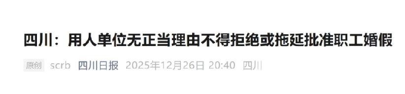 婚假不得拖延批准或打折扣 前不久有人在四川问政平台发消息显露婚假难被批准之事,其原因为“公司不承认四川省发的文件20天婚假。”“私企没接到婚假延长通知 ”。一句话申请批准婚假成了难题。文件得不到执行这可不行。现在四川省人力资源和社会保障厅,为了职工能够享受到法定婚假,专题下发通知,强调用人单位无正当理由不得拒绝或拖延批准职工婚假。不执行的用人单位,会被罚款,通报,处分。这事不小,关系到年轻人结婚,生娃,国家兴旺的大事。各省各地方都要深入调查此事执行情况,仿照四川,把工作落实到实处。
