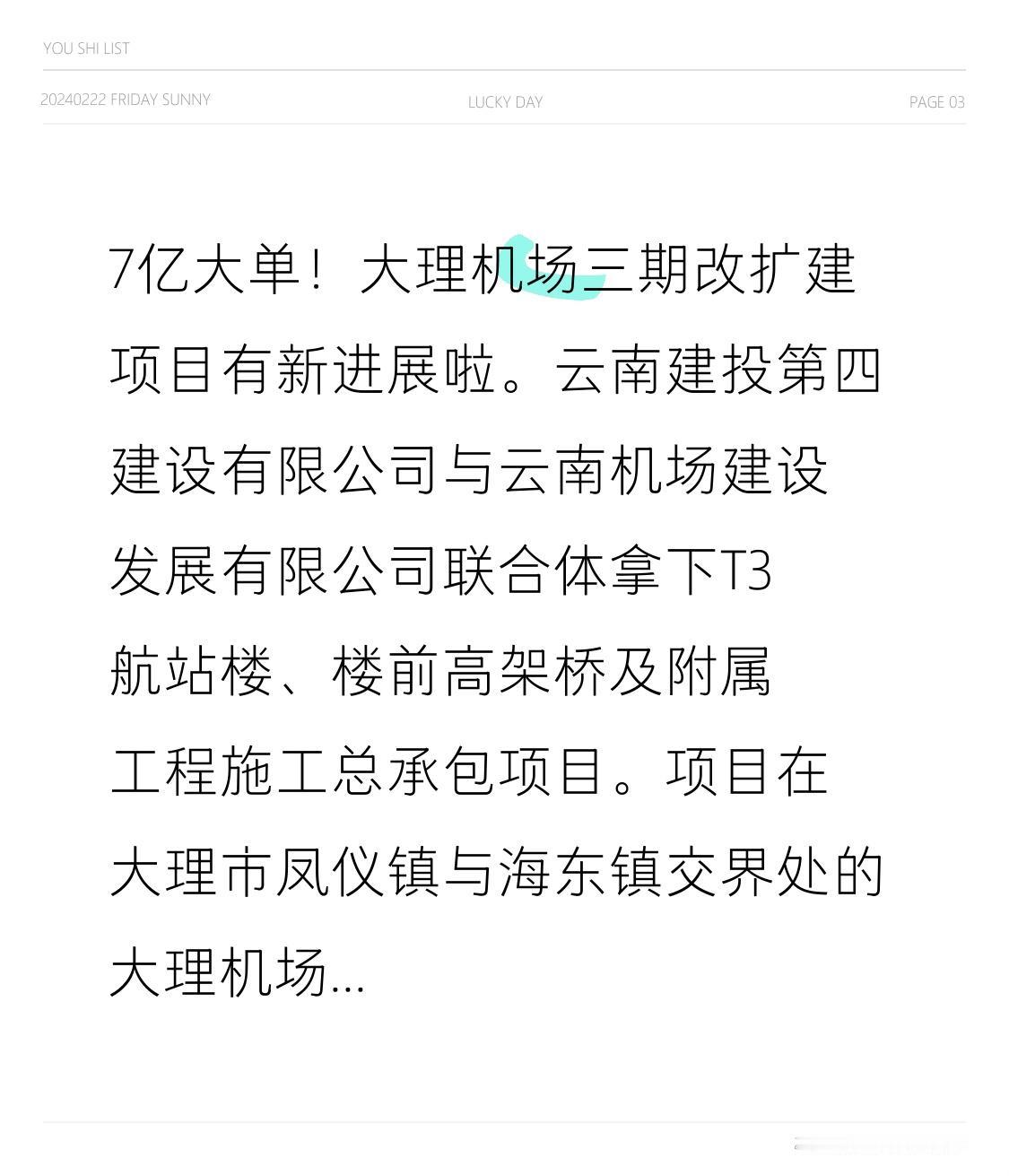 7亿大单!✈️大理机场三期改扩建项目有新进展啦。 云南建投第四建设有限公司与云南机场建设发展有限公司联合体拿下T3航站楼、楼前高架桥及附属工程施工总承包项目。 项目在大理市凤仪镇与海东镇交界处的大理机场内。T3航站楼建筑面积约33851.24㎡,按绿色二星等级设计,2030年预计满足390万人次国内旅客吞吐量。楼前高架桥桥面面积约14544㎡,有6条桥梁匝道。这次改扩建完成后,大理机场的运输能力和服务水平肯定能上一个新台阶,未来去大理旅游也会更方便,太期待了! 这一7亿大单项目的承接,无疑是云南建投第四建设有限公司与云南机场建设发展有限公司实力的彰显。想象一下,未来的大理机场T3航站楼,以绿色二星等级标准建成,不仅美观大气,还节能环保。旅客们在这样舒适的环境中候机、出行,心情也会格外舒畅。 楼前那面积约14544㎡的高架桥,6条桥梁匝道如同城市的脉络,将极大地提升机场周边的交通疏导能力,让旅客们能更快速地进出机场。 对于大理这座旅游胜地而言,机场改扩建意义重大。随着运输能力和服务水平的提升,将吸引更多游客前来。或许以后,我们能看到来自五湖四海的朋友,一下飞机就能感受到大理的风花雪月。当地的旅游业也会因此迎来新一轮的发展高潮,更多的民宿、餐厅、景点将被大家熟知。 相信在建设者们的努力下,项目定能按时、高质量地完成。到那时,大理机场将以全新的姿态迎接每一位旅客,成为大理这座城市的又一张闪亮名片,就让我们一同翘首以盼吧!