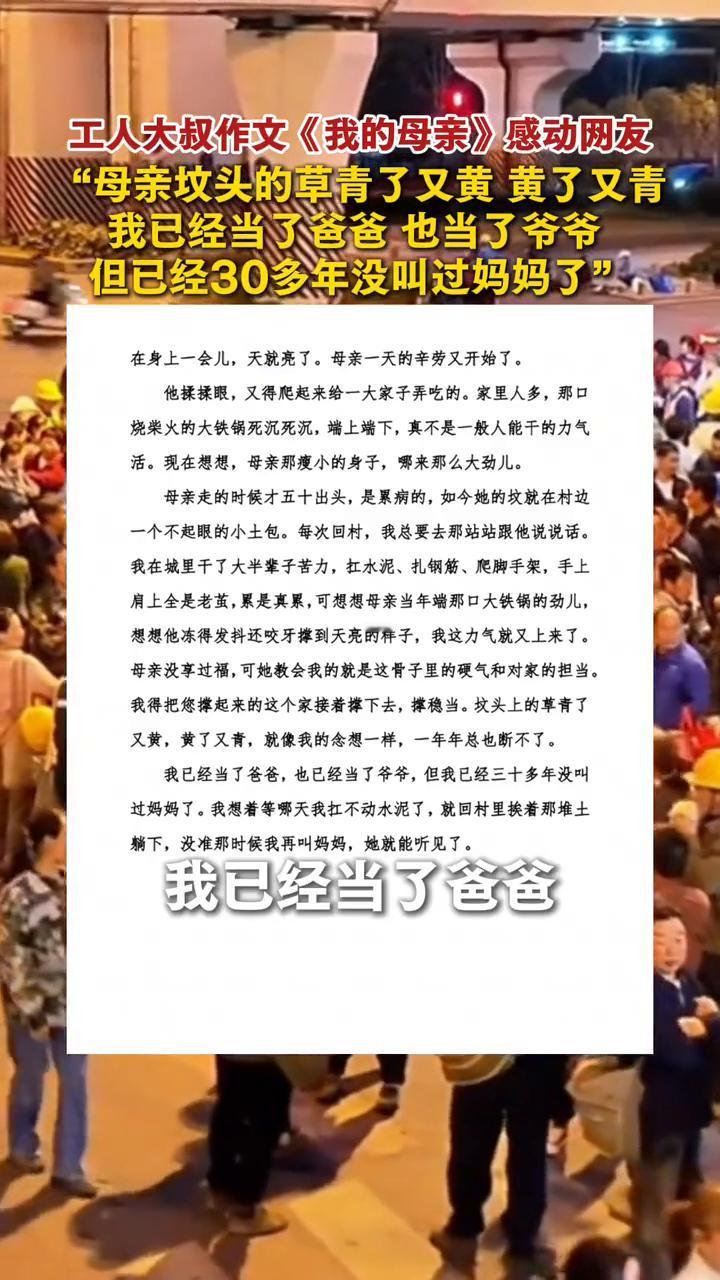 工人大叔作文《我的母亲》感动网友:"母亲坟头的草青了又黄,黄了又青,我已经当了爸爸也当了爷爷,但已经30多年没叫过妈妈了"。 母亲走了30多年了,就埋在村头的老坟地里,坟头上的草青了又黄,黄了又青,就像我的念想一样,一年年总也断不了。我已经当了爸爸,也已经当了爷爷,但我已经30多年没叫过妈妈了。我想着,等哪天我扛不动水泥了,就回村里挨着那堆土躺下,没准那时候我再叫妈妈,她就能听见了。