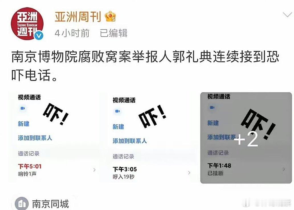 亚洲周刊:南京博物院腐败窝案举报人郭礼典连续接到恐吓电话!看来越挖越深,后面的人害怕了。