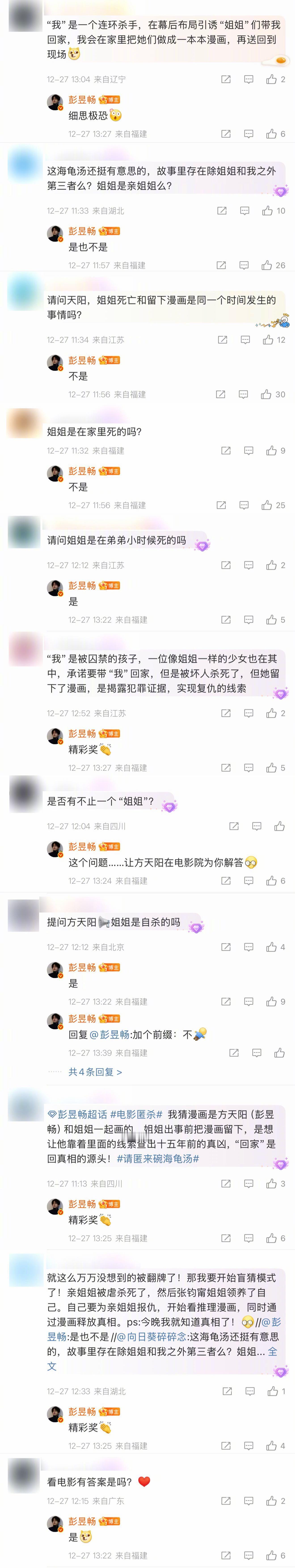 彭昱畅评论区细思极恐粗思更恐 所有人拿出智能手机,立刻点开的评论区!好一场酣畅淋漓的海龟汤推理,看得人心头一紧又一紧,彭彭这回是真闭眼玩家了!期待电影《匿杀》12月31日全国上映,跟着方天阳的视角探索更刺激的悬疑故事!