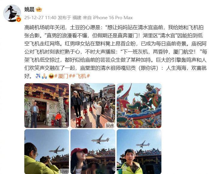 儿子帮姚晨和低空飞机合照 高崎机场明年关闭,土豆的心愿是:“想让妈妈站在清水宫庙前,我给她和飞机拍张合影。”直男的浪漫看不懂,但假期还是直奔厦门!湖里区“清水宫”因能拍到低空飞机走红网络。