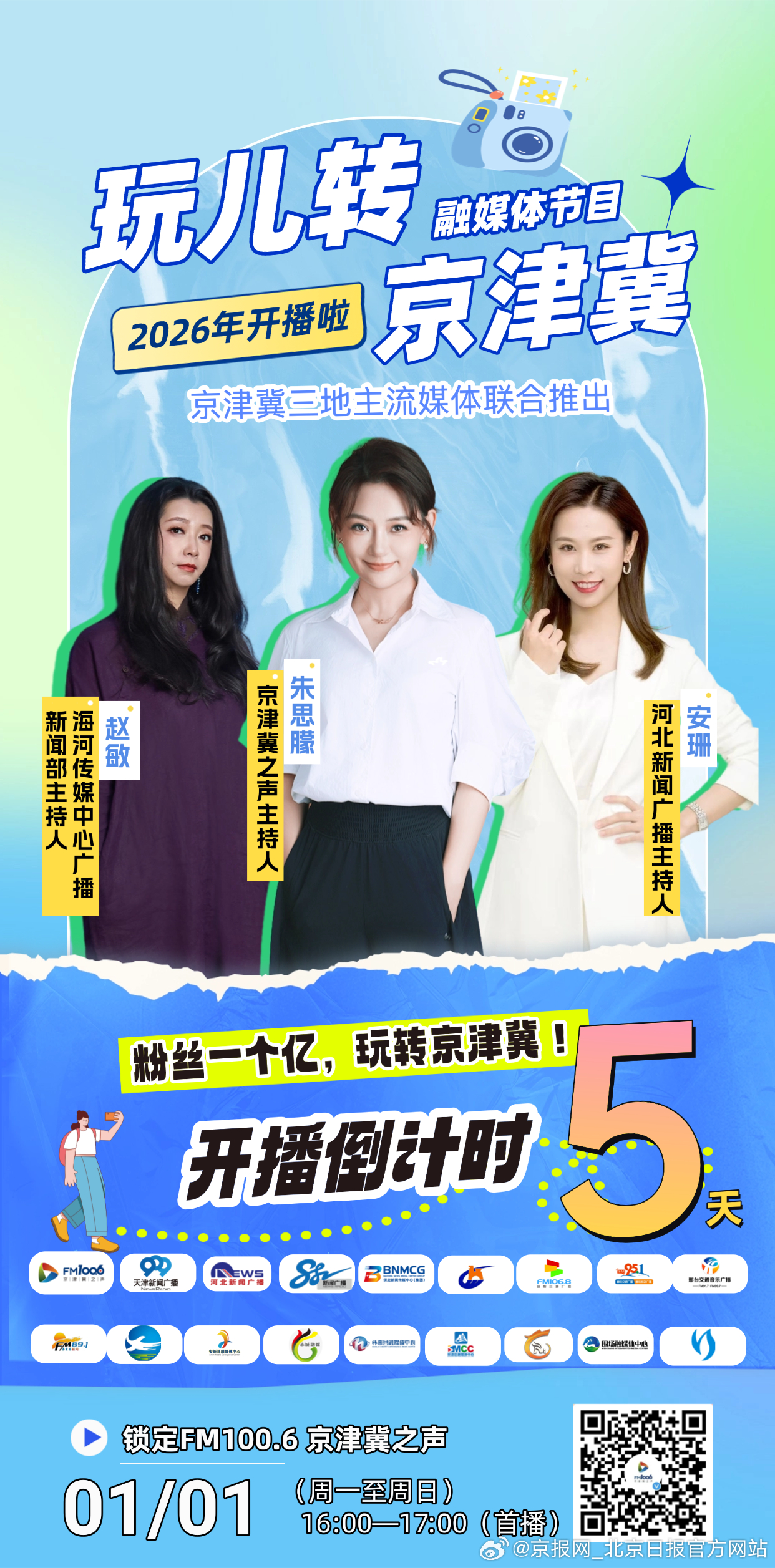 #玩儿转京津冀#【京津冀三地联动,带你解锁京津冀协同下的文旅新体验】京津冀三地串儿门攻略即将解锁!2026年1月1日,由京津冀三地主流媒体联合打造的融媒体节目《玩儿转京津冀》即将开播。一档节目承包你的吃喝玩乐游购娱!从北京的皇家园林,到天津的海河风情,再到河北的山河壮美,跟《玩儿转京津冀》一起,解锁京津冀协同下的文旅新体验!每天16:00—17:00(首播),锁定FM100.6,三地主持人带你玩儿转京津冀!#京津冀三地联动带你向快乐出发# (海报设计:一如)