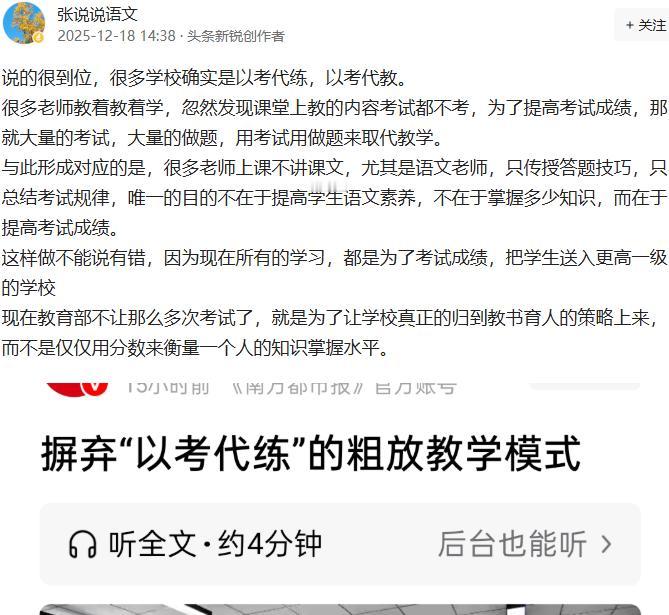 很多学校确实是以考代练,以考代教。 很多老师教着教着学,忽然发现课堂上教的内容考试都不考,为了提高考试成绩,那就大量的考试,大量的做题,用考试用做题来取代教学。 有些老师上课不讲课本,只传授答题技巧,只总结考试规律,唯一的目的不在于提高学生真正的能力,不在于掌握多少知识,而在于灌输知识,在于提高考试成绩。 这样的学习,都是为了考试成绩,把学生送入更高一级的学校。 现在教育部不让那么多次考试了,就是为了让学校真正的归到教书育人的策略上来,而不是仅仅用分数来衡量一个人的知识掌握水平。